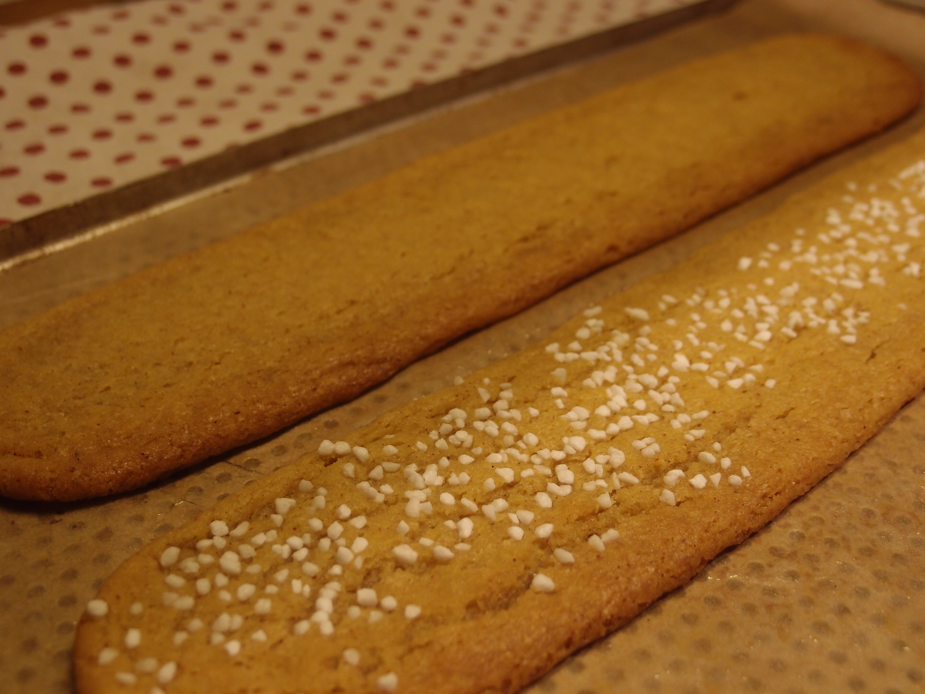 Sätt ugnen på 150-175 grader. Kör ingredienserna till en smidig deg i en degblandare/matberedare eller knåda ihop för hand. Rulla ut 2 långa korvar som du lite lätt plattar till med fingrarna. Lägg ut dem på en plåt med bakplåtspapper och grädda i mitten av ugnen tills de får lite, lite färg. Om de flyter ut mycket så fös in kanterna med hjälp av eggen på en stor kökskniv. Skär i snittar medans kakorna är lite varma. Går finfint att frysa in.