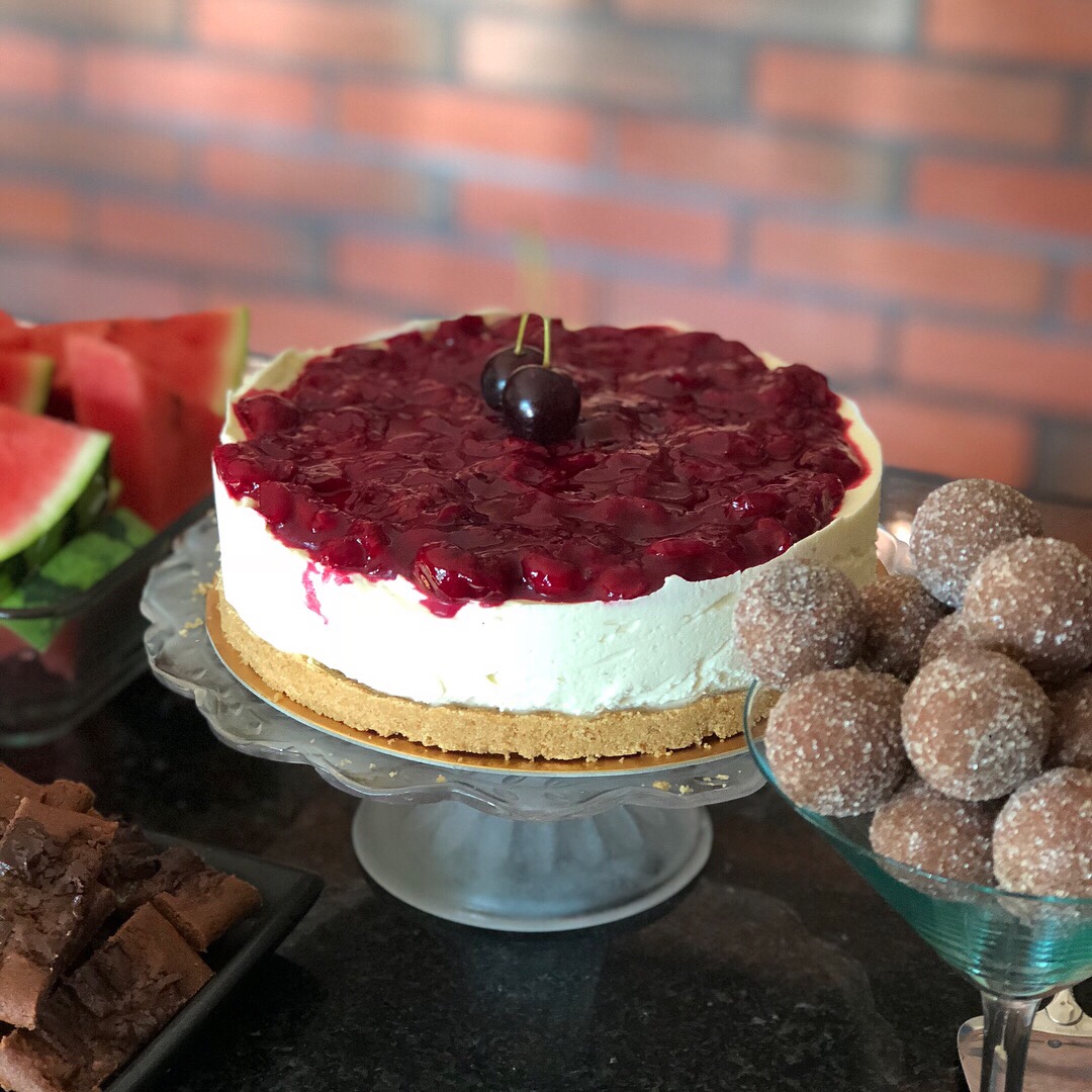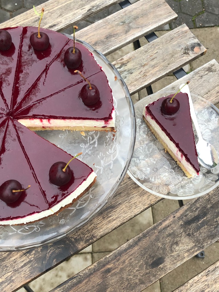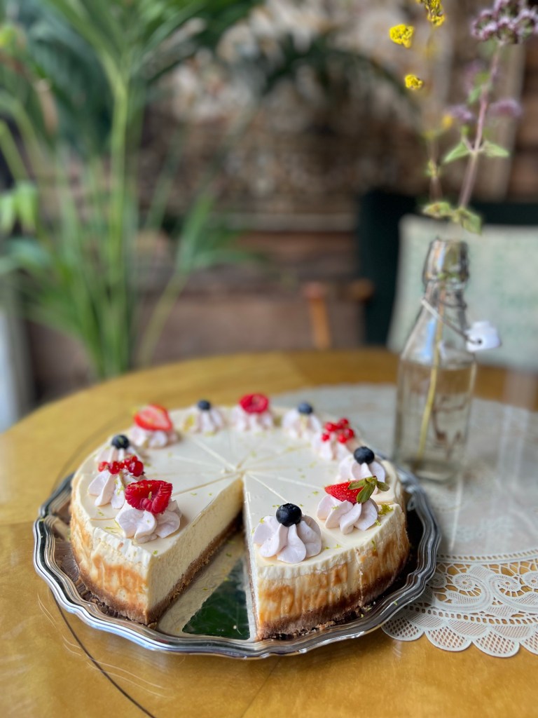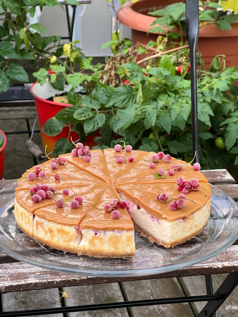 En krämig New York cheesecake, enkel att baka och enkel att lyckas med. Här höstpimpad med syrliga vinbär och sötsalt kola. Trixet att få kolan att stanna kvar på kakan och inte rinna av, stavas gelatinblad.