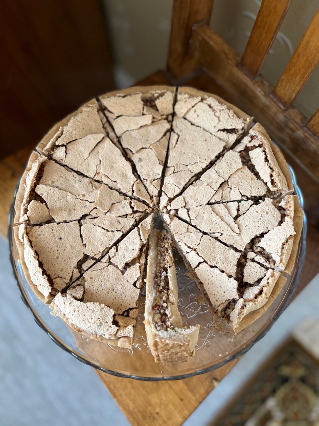 Mandel- och hasselnötsmarängpaj med lingongrädde