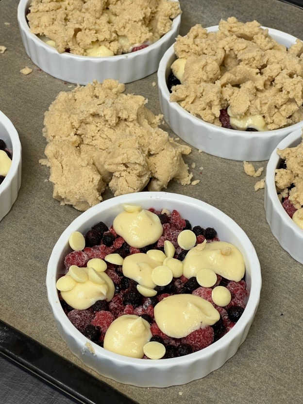 Nyp el knåda snabbt ihop tärnat smör med resten av ingredienserna till degen och lägg ut små kluttar av den på varje paj (ca 95 g deg per paj).
