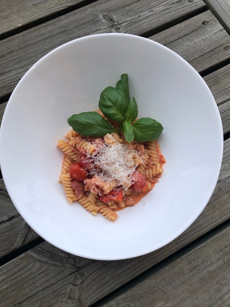 Egentligen skulle jag laga den omtalade penne vodka till middag en lördag när vi var barnfria. Och det gick ju bra ända tills vi insåg att vodkan var rom. Men det blev en god middag iaf, helt utan sprit.