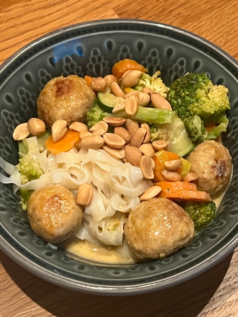 Dessa kycklingköttbullar är supergoda! Jag serverade dem som topping på en nudelsoppa men du kan lika gärna servera dem som de är på en buffé, i en wrap, med ris och någon sås med kokosmjölk.