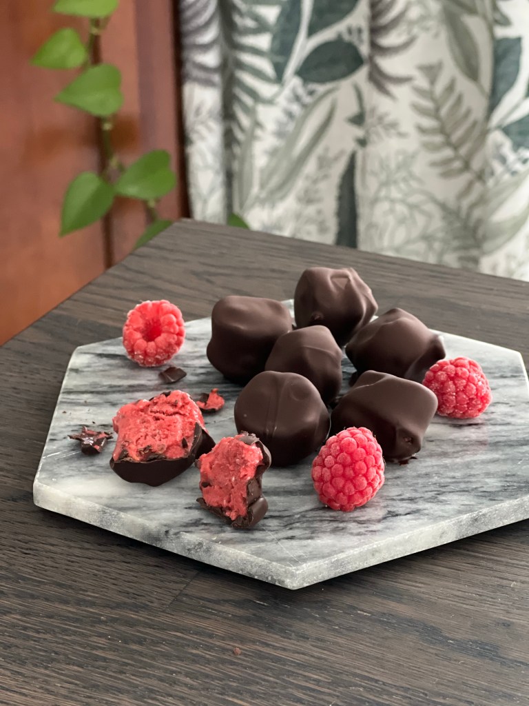 Jag har labbat fram de allra godaste och fräschaste rawfoodbollarna med tydlig smak av hallon. Ni måste prova!