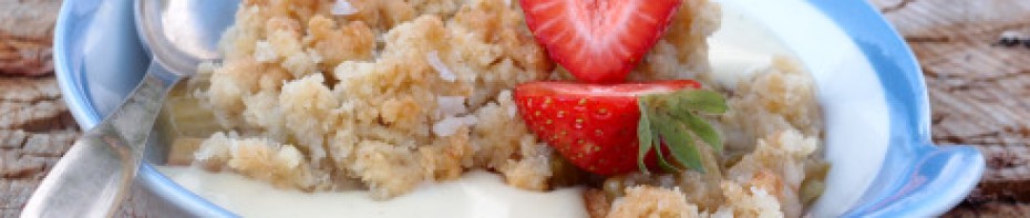 Gräddfilsmousse med rabarber- och hallonkompott samt krossade kokosdrömmar