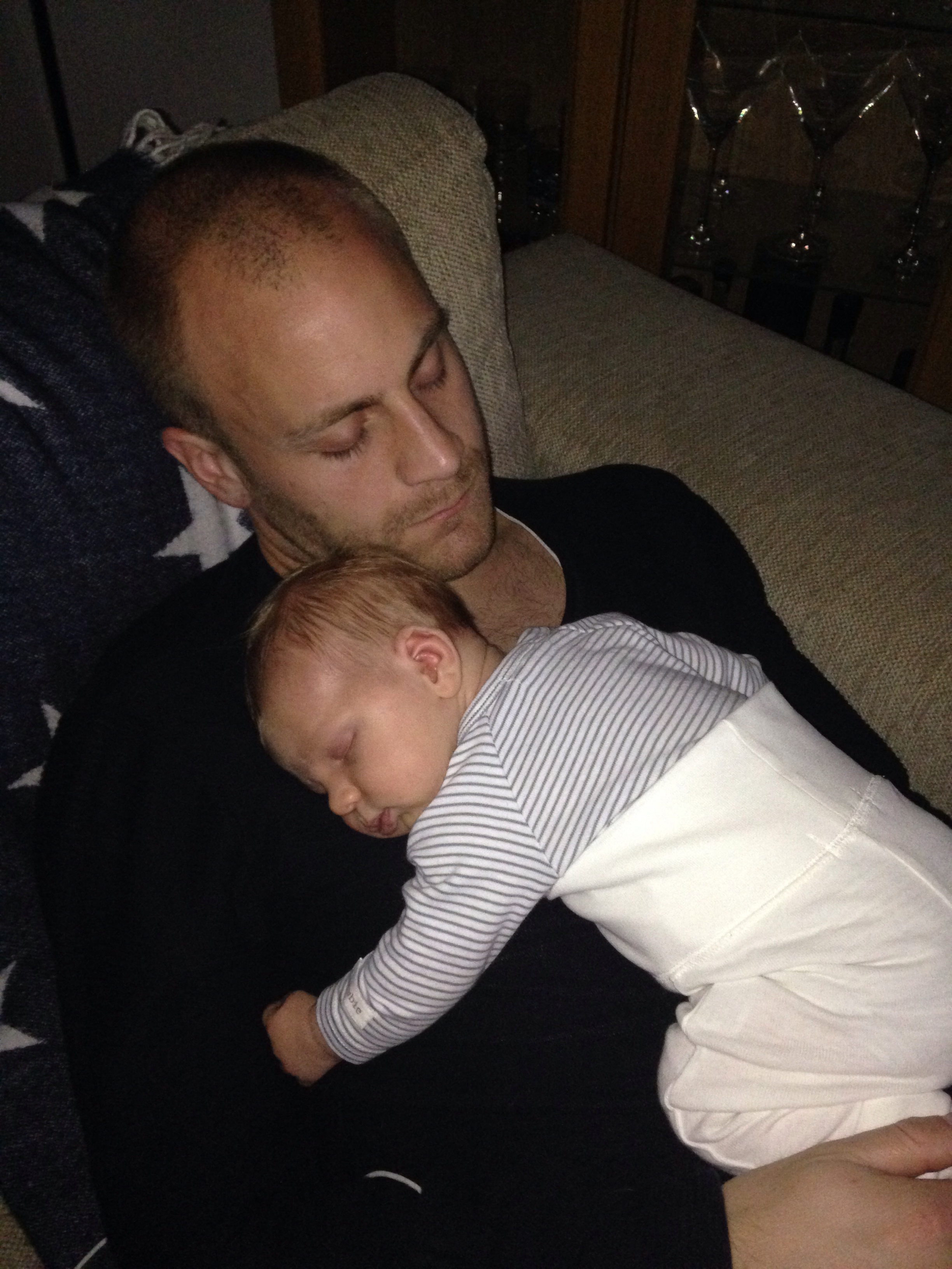 På pappas mage ligger vår lilla groda varje kväll och myser i favoritposen. Byxorna är visst uppdragna ända till armhålan 🙂