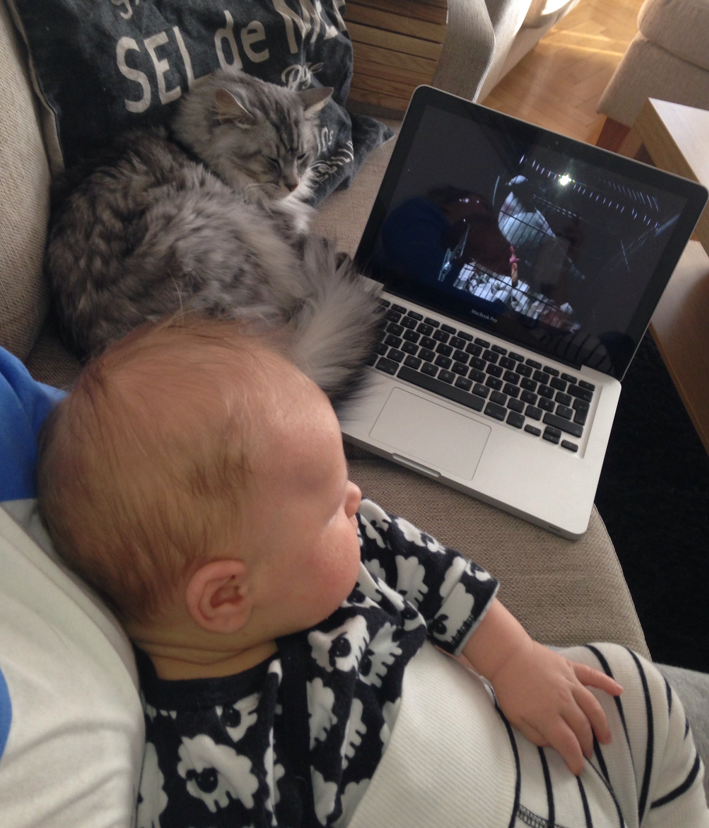 Så här kan det se ut när vi myser till det framför en serie på datorn. Lillen älskar att somna i famnen och Kokos (vår katt) är inte sen att joina oss!