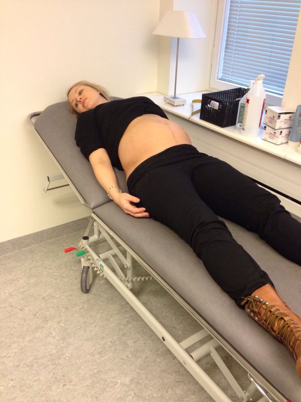 Jag bjuder på den här osmickrande bilden hos barnmorskan. 😉 Ser varken bekvämt eller avslappnat ut.. Vi ska precis lyssna på bebisens hjärtljud. Här syns hormonranden tydligt på magen. Hoppas klara mig utan bristningar dock…