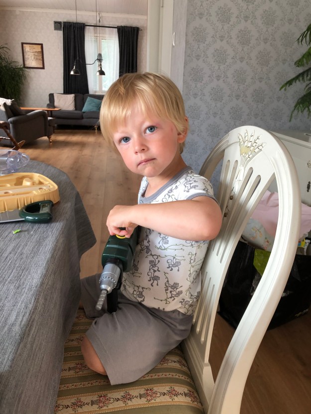 På födelsedagsmorgon vaknade vi hos kusinerna minsann och där fick han öppna sina populära paket; borrmaskinen och motorsågen.