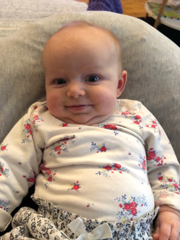 Som ni kanske minns från senast så var Winter en liten exemplarisk prinsessa första två veckorna. Sedan hände det något. Hon blev skrikig. Ja nästan så att vi misstänkte kolik, men det var aldrig ens i närheten av den intensiteten och längden som krävs för det. Men riktigt jobbigt ändå med ett barn som ”aldrig” är nöjd, förutom när hon får bröstet eller får vara och sova i famnen. Efter en vecka fick vi hjälp, i form av magdroppar och miniform som ska slå hål på luften i magen så att den lättare kommer ut. Det har faktiskt fungerat. Inte till 100 % men tillräckligt mycket. Efter vecka 6 tyckte jag det vände till det bättre på riktigt och sedan hon passerade 8 veckor så måste jag säga att hon knappt skriker längre på dagarna – bara hon får vara i famnen, hos nån av oss. Hon vill inte bli lämnad själv om vi säger som så, knappt ens i samma rum.