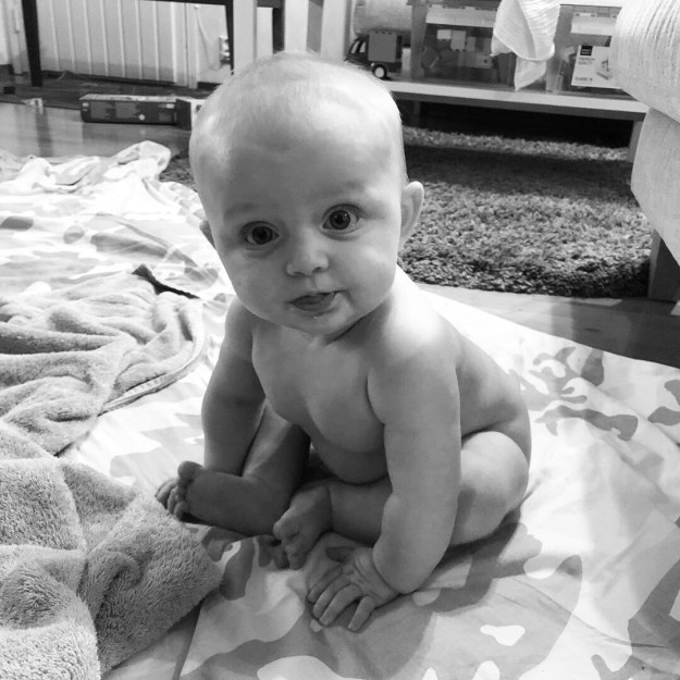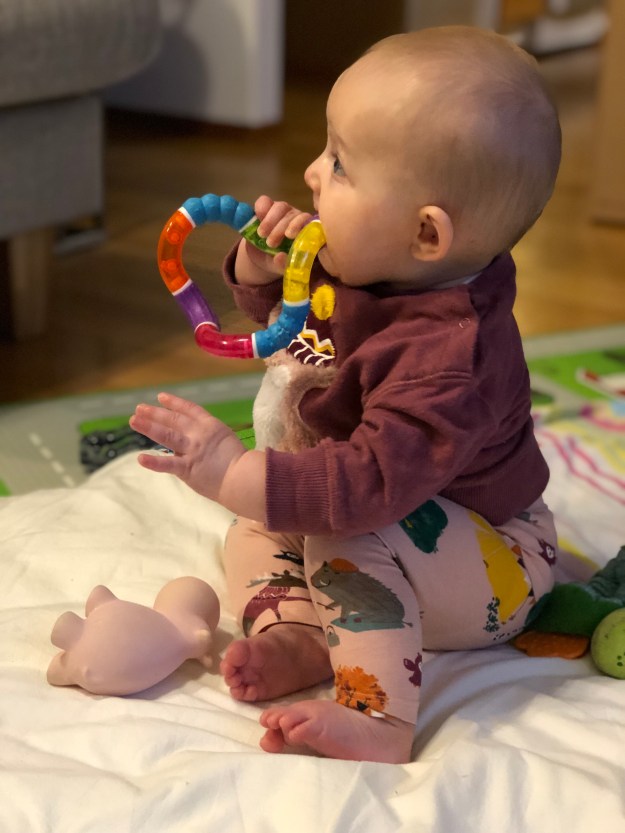 Vad har hon för personlighet då vår lilla donna? Jo hon är som sagt företagsam och kräver sin uppmärksamhet och tillsyn. Hon blir bara gladare och gladare hela tiden så den där lilla skrikiga citronen som vi lärde känna i början är mycket mysigare att hänga med nuförtiden. På morgnarna är hon på bäst humör och på kvällarna har hon varit på sämst humör. (Men det börjar vända till det bättre – allt i takt med att hon upptäcker hur kul det är sitta och leka själv). Hon mmmm:ar när hon äter (precis som Walentin gjorde) och ylar friskt när hon testar rösten. Vi andra har tinnitus, haha! När hon är ledsen är det mest mamma och bröstet som gäller men i övrigt är hon nöjd i vilken famn som helst, man får gärna bära runt på henne el sätta henne i vår snart 40 år gamla inomhusgunga i brunt och orange. Nu när hon äntligen sitter så är hon mycket nöjdare att sitta på mjuka underlag och pilla med sina leksaker i lite längre stunder. Men hon tar sig fram snabbt så att lämna henne ensam är det inte tal om. Och så babblar hon ganska mycket, himla mysigt att lyssna på!