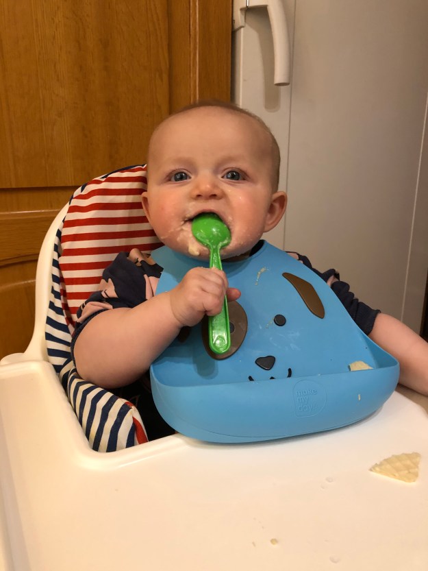 Runt 5 månaders strecket började jag ge lite annan mat till henne förutom bröstmjölk (jag ammar fortfarande och planen är att amma 6 månader till om vi båda vill). Hon verkar gilla mat! Nu fastnar mer mat i magen än vad som kommer ut så vi är definitivt på banan. Mest blir det gröt, frukt och såklart lite varm mat till middag. Vi skippar välling helt, dels för att ingen av pojkarna ville ha välling – så det är inget vi är vana med – men främst för att barnmorskan rådde oss att välja gröt istället då det mättar bättre och inte ger ett ”välling och flaskberoende ”- kanske in på nätterna dessutom. Smörgåsrån och majskrokar gillar hon skarpt att gnaga på. Det är så himla skönt att hon kan sitta med oss vid matbordet, i egen stol, kändes lite jobbigt tidigare när hon låg missnöjd i myspölen på golvet när vi andra åt eller fick sitta i famnen på någon av oss. Men jag njuter tyvärr inte av våra familjemiddagar än, de är alldeles för bullriga, stressiga och skrikiga…undrar om vi ska börja låta barnen äta först och sedan själva äta under lite lugnare former efter dem? Hur gör ni?