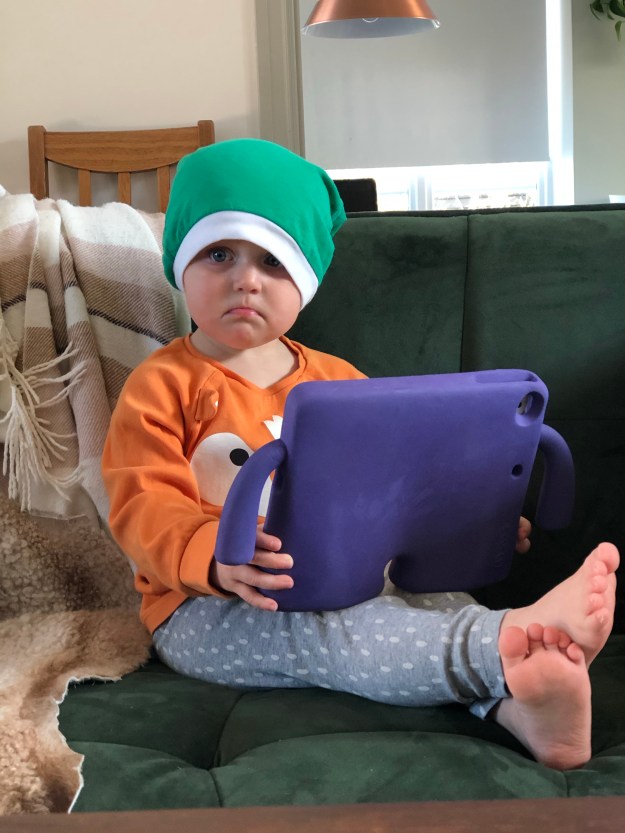 Vad tittar hon på då? Helst försvinner hon in på youtube och svipe:ar fritt bland barnprogram men om jag får välja blir det Netflix-serier för barn på finska. Jag tror ni kan gissa var hon oftast hamnar…. (På bilden är jultomteluvan från ett pyjamas kit på, det var också en fas som höll i sig länge…..).