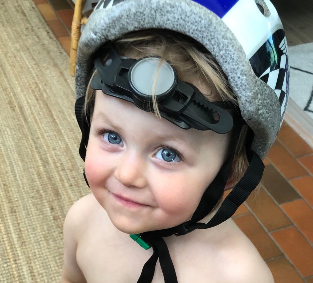 Födelsedagsbarnet! I ny klänning, med nytt gossedjur och så hjälmen förstås. (Japp, rosa är en favoritfärg!).
