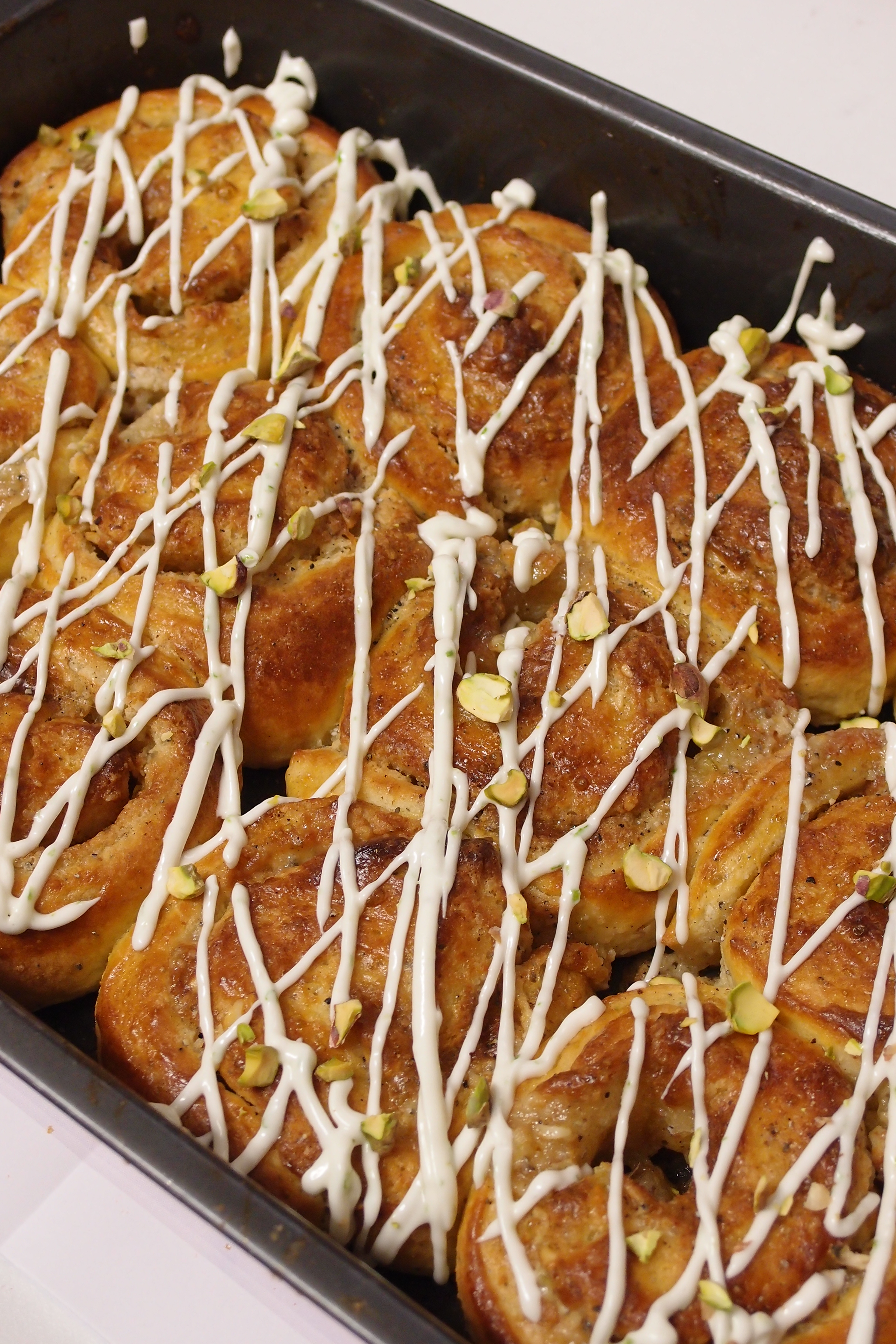 Ett ganska litet recept, där bullarna jäser ihop och bryts loss vid servering. Det ger riktigt saftiga bullar. Mandelmassa är mitt bästa trick för en ännu godare fyllning och eftersom den är söt är det extra gott att friska upp med fräsch citron. Prova gärna lime eller apelsin om du föredrar det.