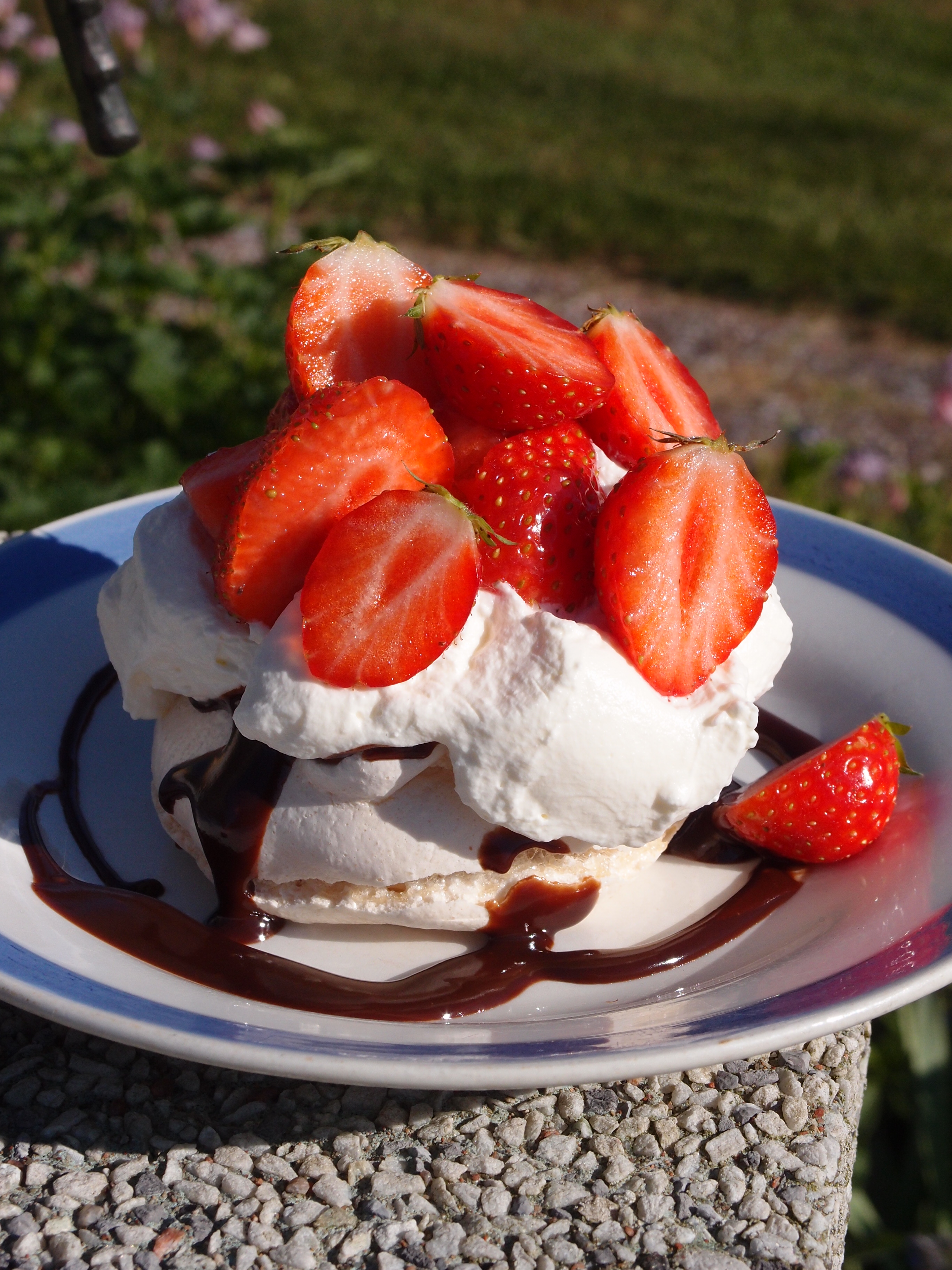Det börjar nästan bli tjatigt – pavlova recepten är överallt, vart man än tittar! Men jag börjar förstå varför. Det kan ju verkligen bli jättegott! Maränger är inte min melodi i vanliga fall, tycker de är ganska menlösa att äta rakt upp och ner och jag har misslyckats otaliga gånger med gräddningen. Men nu så! Nu blev resultatet bra och riktigt gott så idag bjuder jag på en enkel och somrig dessert som man lätt svänger ihop; krispigt sega pavlovabakelser med grädde, jordgubbar och chokladsås. Något för midsommar kanske?