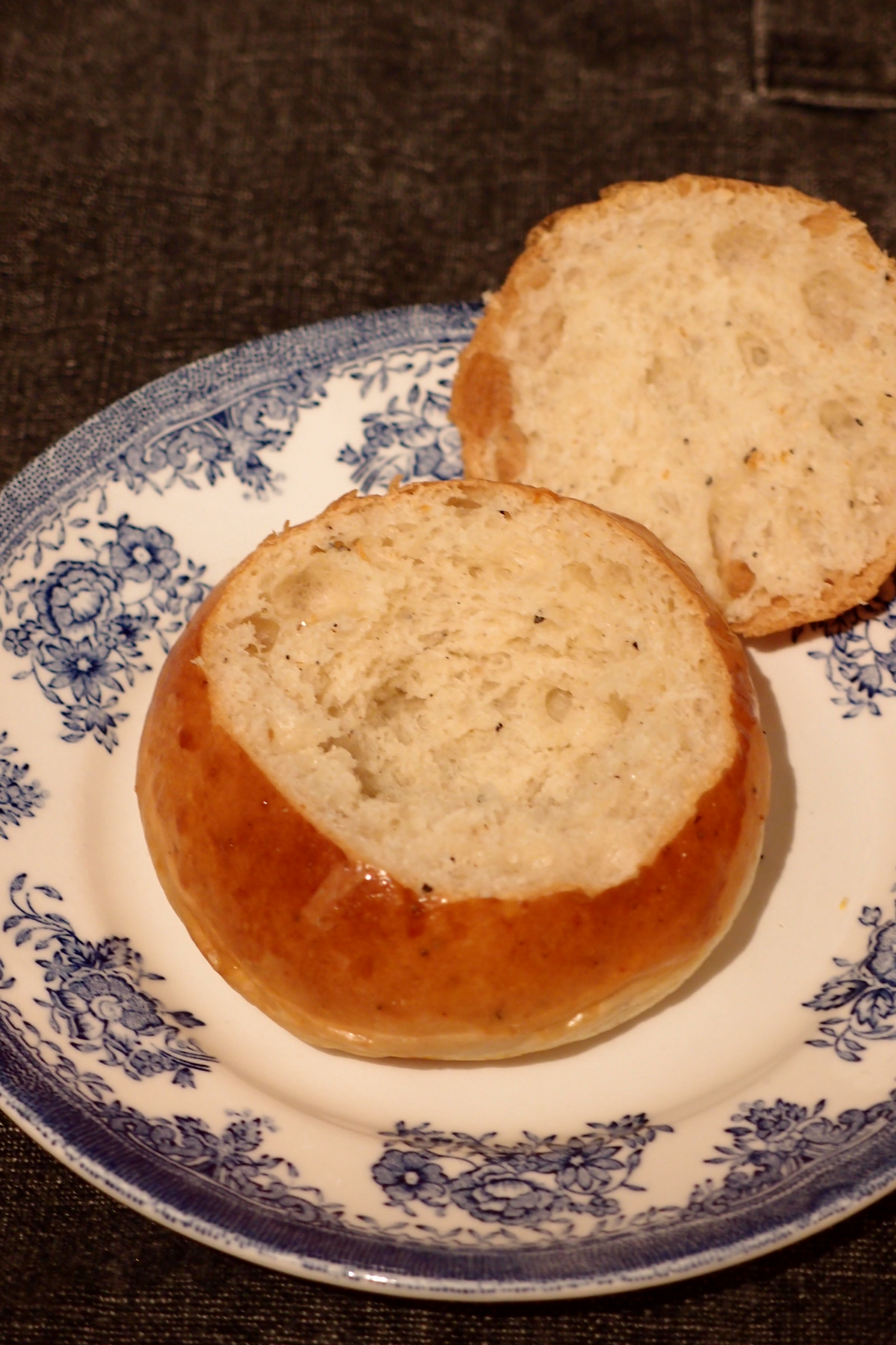 Sätt ugnen på 200° och grädda bullarna ca 8 minuter. De ska få gyllene färg men inte bli brända så håll koll. Låt dem svalna och skär eller klipp sedan trekantiga lock och gröp ur lite av innanmätet. (Spara detta till fyllningen).
