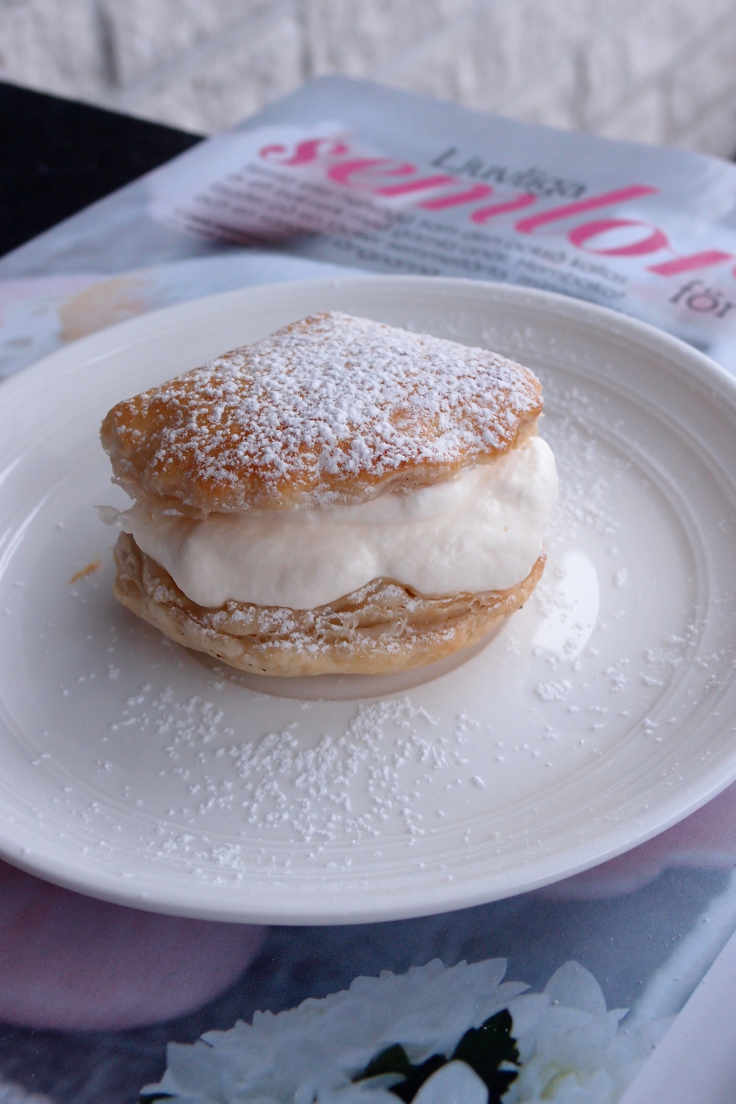 När bullarna svalnat, klipp el skär ut ett lock på dem. Gröp ev ur lite bulle och fyll hålet med mandelfyllning (30 g per bulle). Vispa grädden och smaksätt med vaniljsocker om du föredrar det. Spritsa ut grädden (30 g) på bullarna och toppa med lock och pudra över generöst med florsocker. Servera direkt el förvara i kylen till servering.