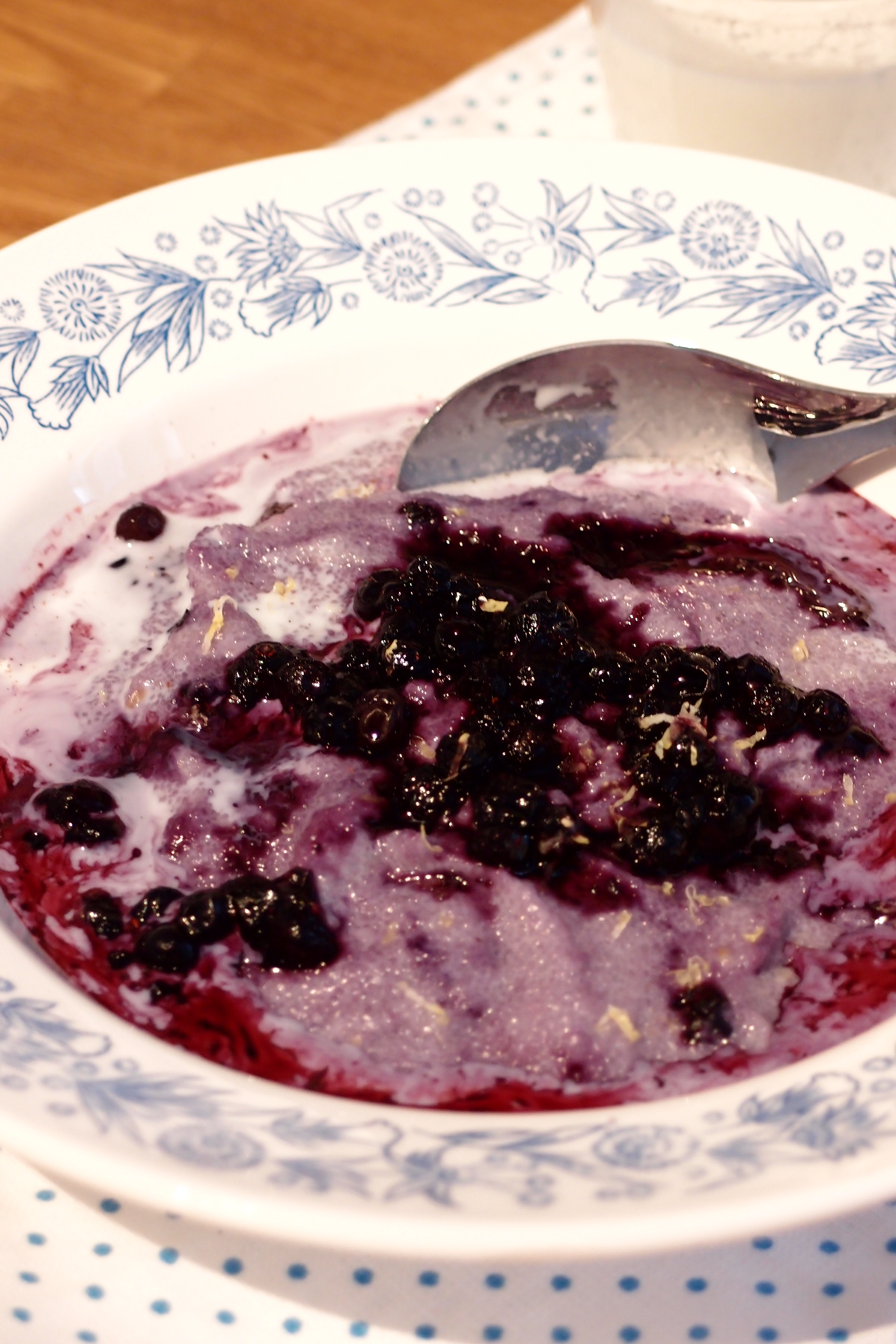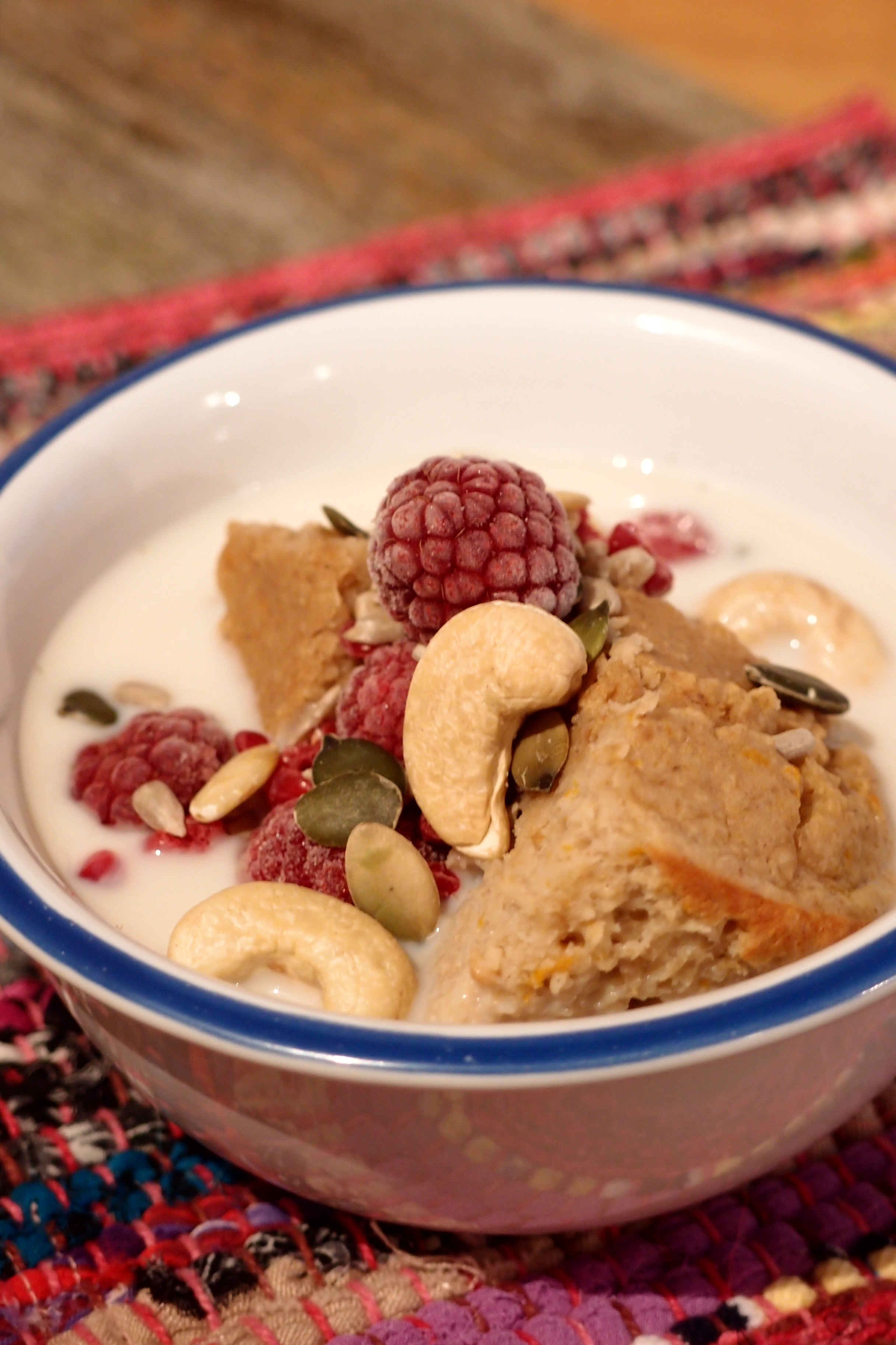 Lite sötare i smaken och godare än vad den låter. Mättande dessutom! Att toppa med sylt tycker jag blir lite väl sött så här blir det kanel, frön, färska bär och några torkade bär istället.