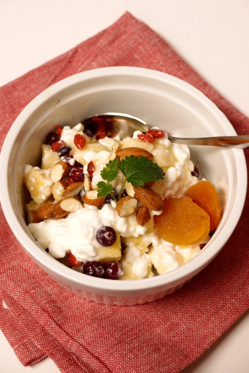 Servera med frukt, bär, gräddkvarg (kvarg + grädde + agavesirap + vaniljfrön), tjock yoghurt, keso, nötter, torkad frukt, honung, agavesirap…