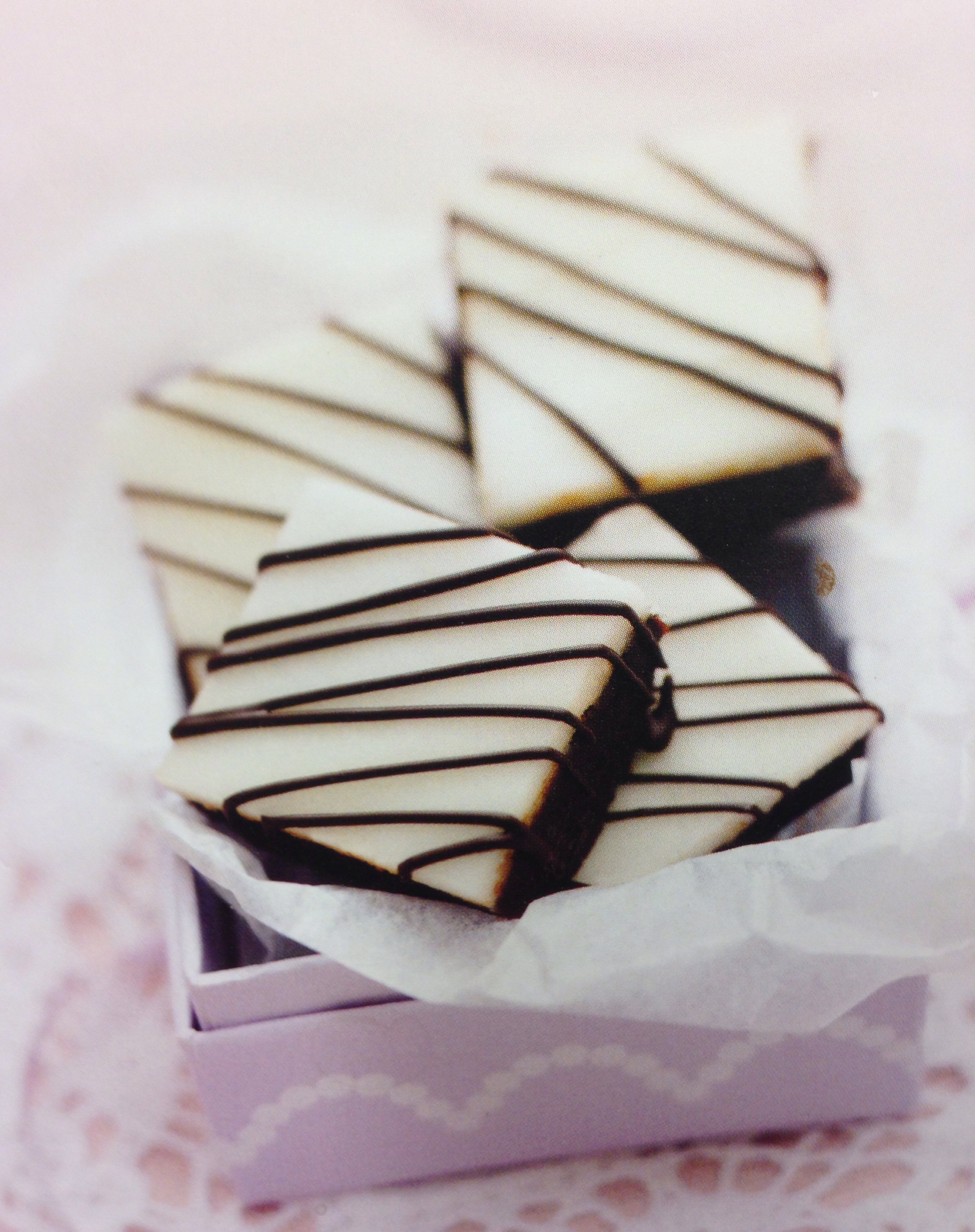 Bryt chokladen i bitar och smält försiktigt i mikrovågsugnen under korta intervaller eller över ett vattenbda. Tillsätt oljan och bred snabbt ut över hela kakan, med början ifrån mitten. Garnera gärna!