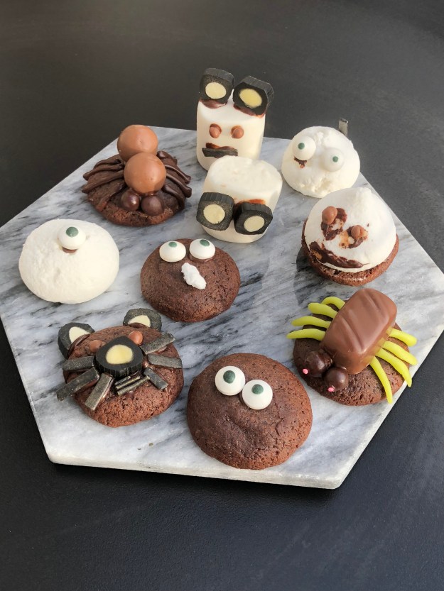 De bruna kakorna är mini kladdkakskakor och sen rotade jag fram salmiakströssel, chokladkulor, ätbara ögon, en bit överbliven marsipan, citronfylld lakrits (som jag skar i bitar), några maränger och marshmallows som var kvar från ett kalas och så limmade vi med smält choklad (fazer block dekor – stelnar snabbt!). Sen lät vi fantasin flöda.