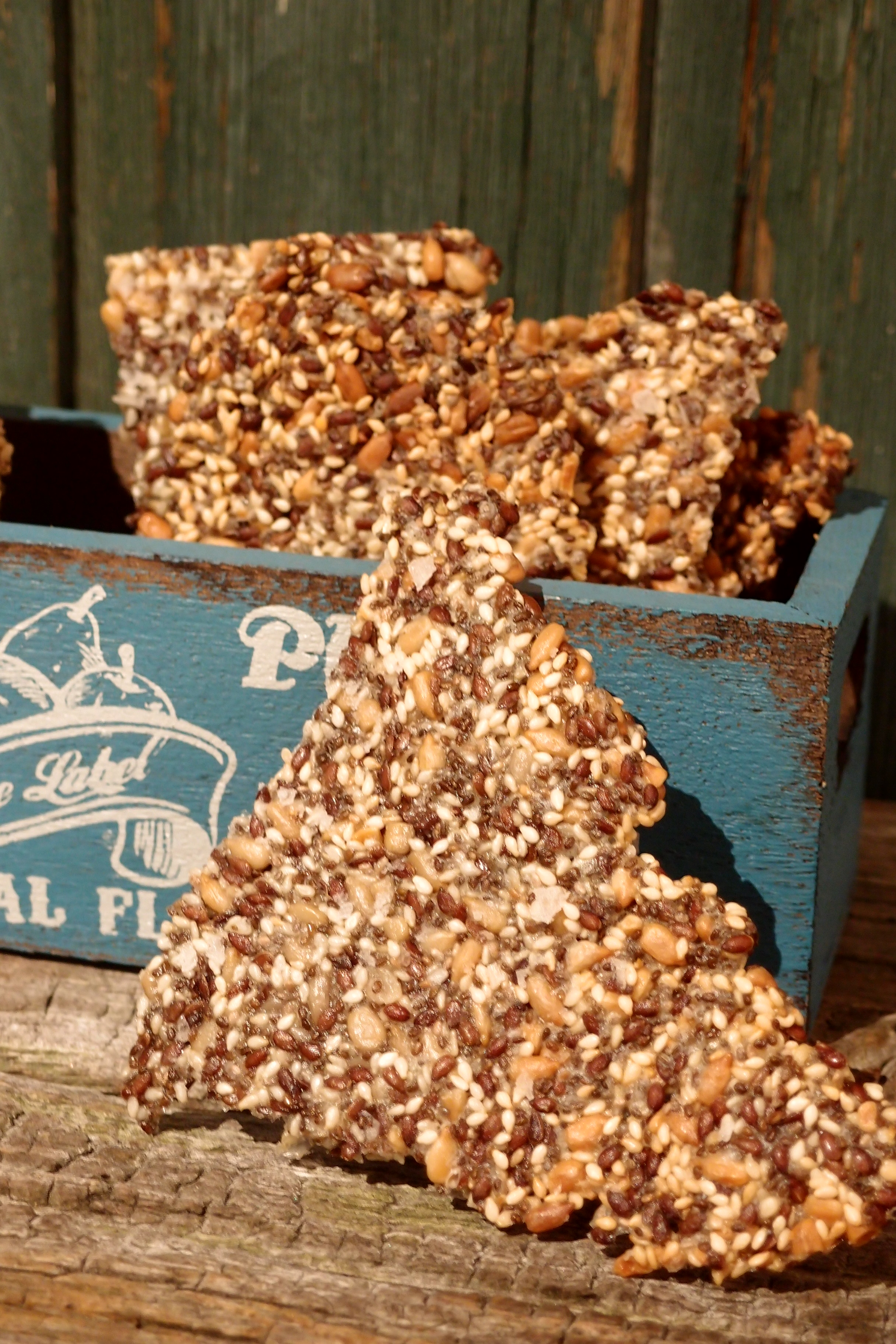 Tack bästa Josse för receptet! Här kan man också blanda olika frön, jag tog lika delar chia- och linfrön i stället för pumpakärnor. Det här knäcket fick lättare färg i ugnen och är därmed lite frasigare och snäppet smakrikare. Ett mycket gott snack – precis som det är.