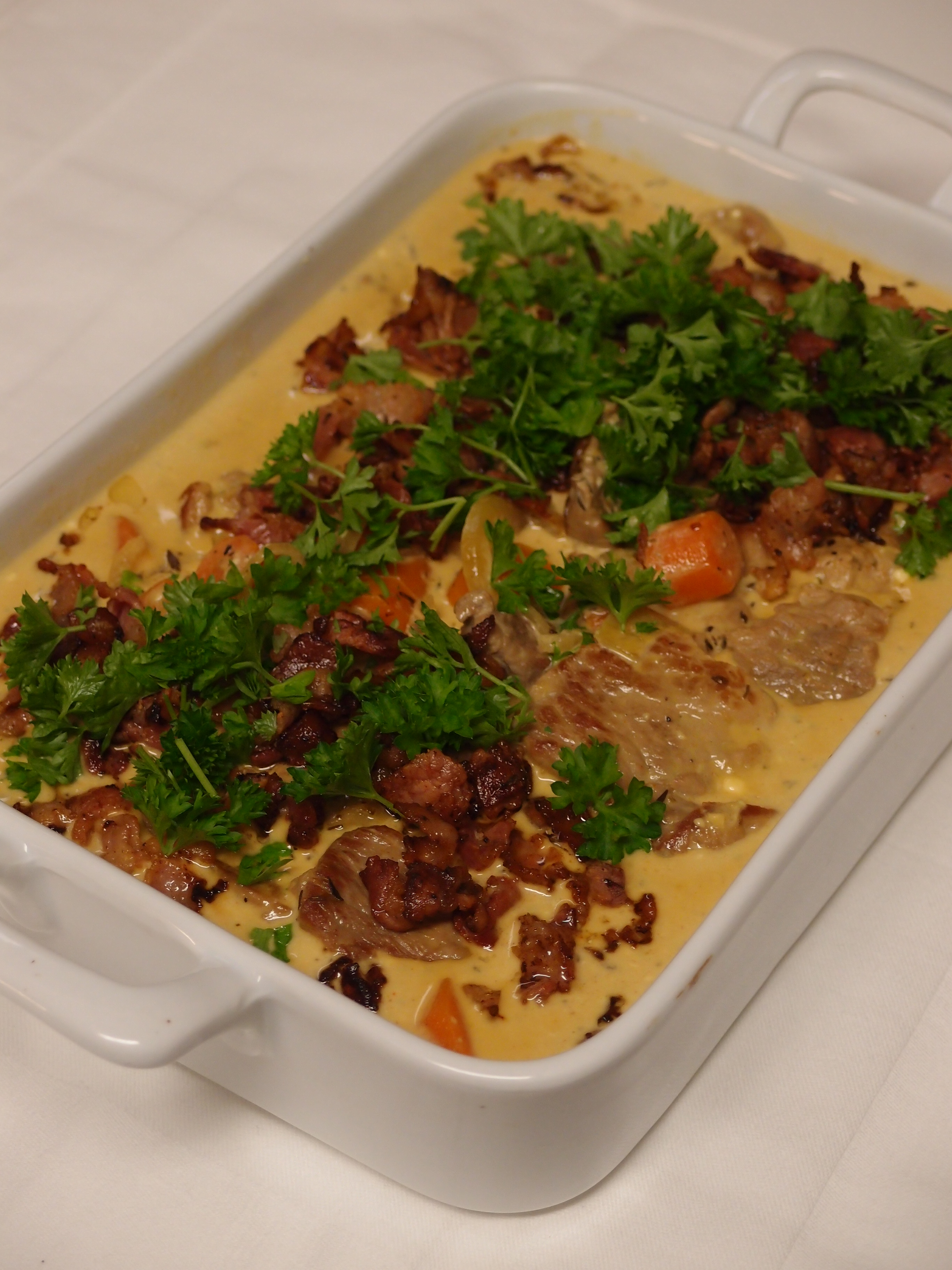 Skala och halvera lökarna, skiva dem tunt och stek mjuka och glandiga i smör. Häll över i en gryta. Putsa och skär köttet i 1 cm breda skivor. Bryn i smör och krydda med salt, peppar, cayenne och timjan. Häll över i grytan. Skär baconet i små bitar och knaperstek det. Låt rinna av på papper. Skala och slanta morötterna och tillsätt dem i grytan. ”Skölj ur pannan” med grädde och tillsätt den samt fraîche, vin, fond, senap och soja i grytan. Låt puttra under lock 10-15 minuter. Smaka av och toppa med bacon och färska örter. Servera med ris eller pressad potatis.
