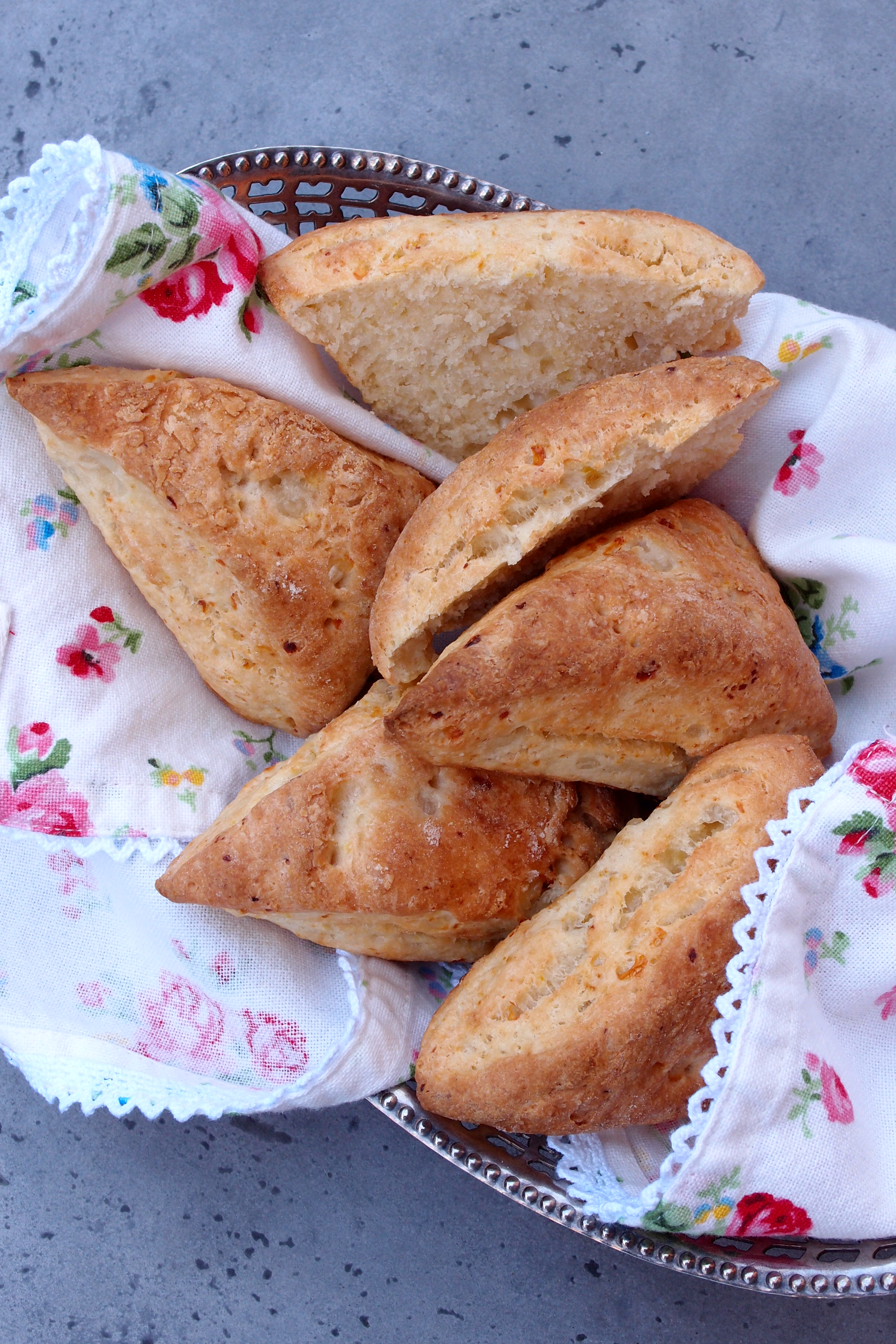 Nyp ihop mjöl, salt, bakpulver och tärnat smör till en grynig massa. Blanda ner yoghurt och keso till en kladdig och ganska stum deg. Tryck med mjölade händer ut en längd, platta till den så den är ca 2 cm hög. Skär ut trekanter och placera dem på en plåt med bakplåtspapper.  Nagga gärna med en gaffel.