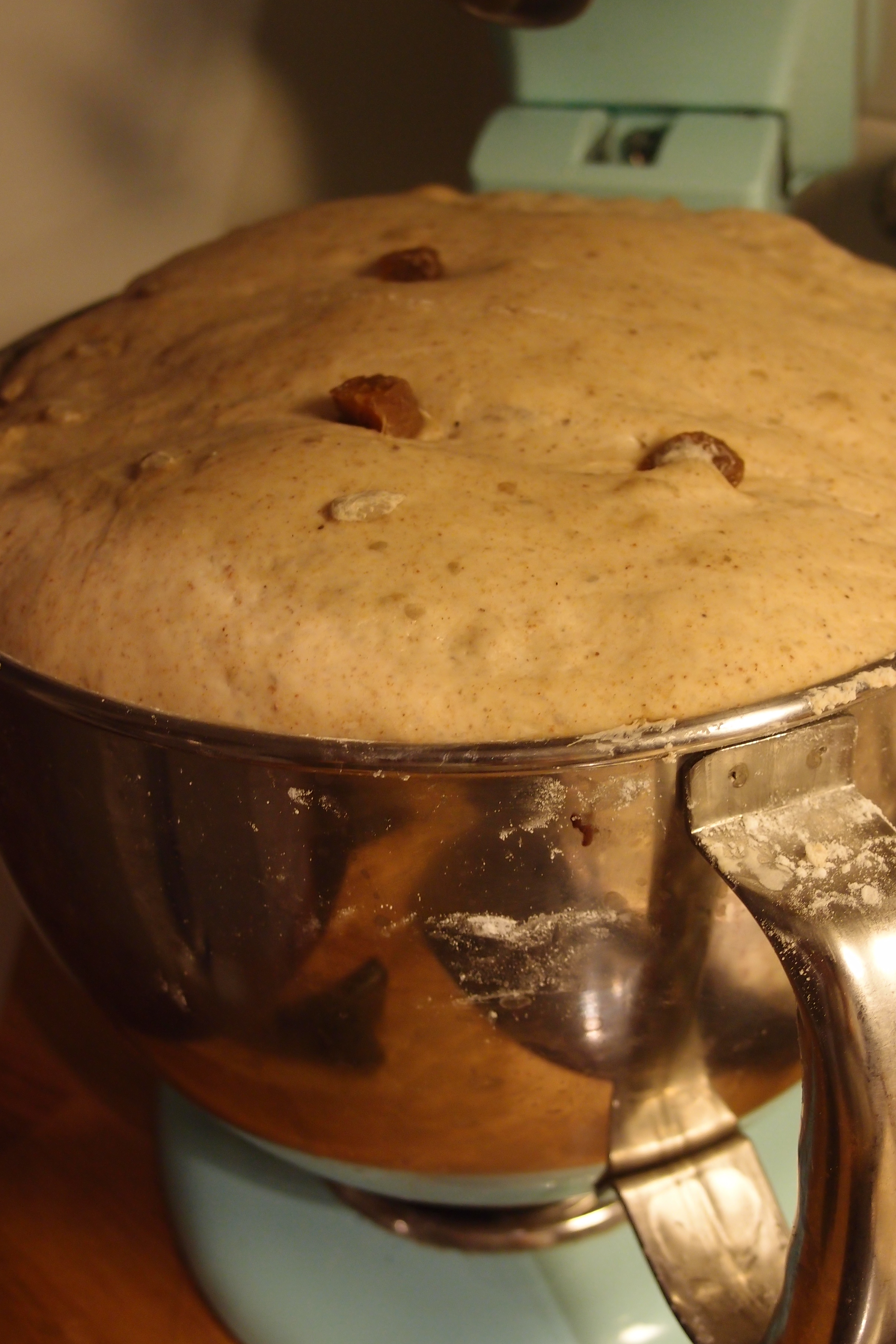 Till receptet under burken på surdegen tycker jag det är lagom med 1-2 dl blötlagda russin, 10-20 torkade aprikoser (blötlagda och klippta i mindre bitar), 1-2 dl solrosfrön och 2 tsk kanel. Jag bakade bröden på de mindre angivelserna men tycker gott man kan öka på lite! Rysligt gott blev det i.a.f.!