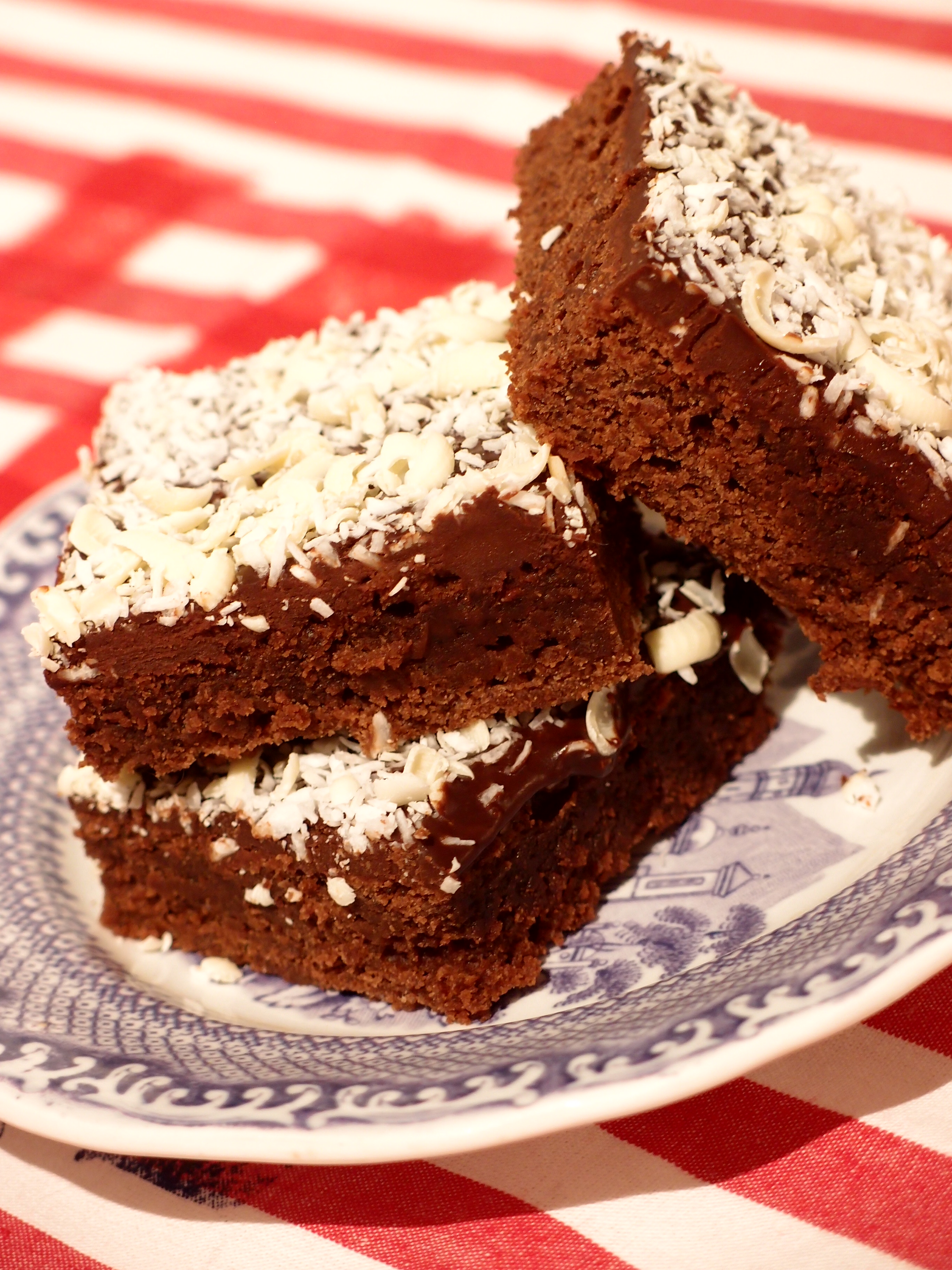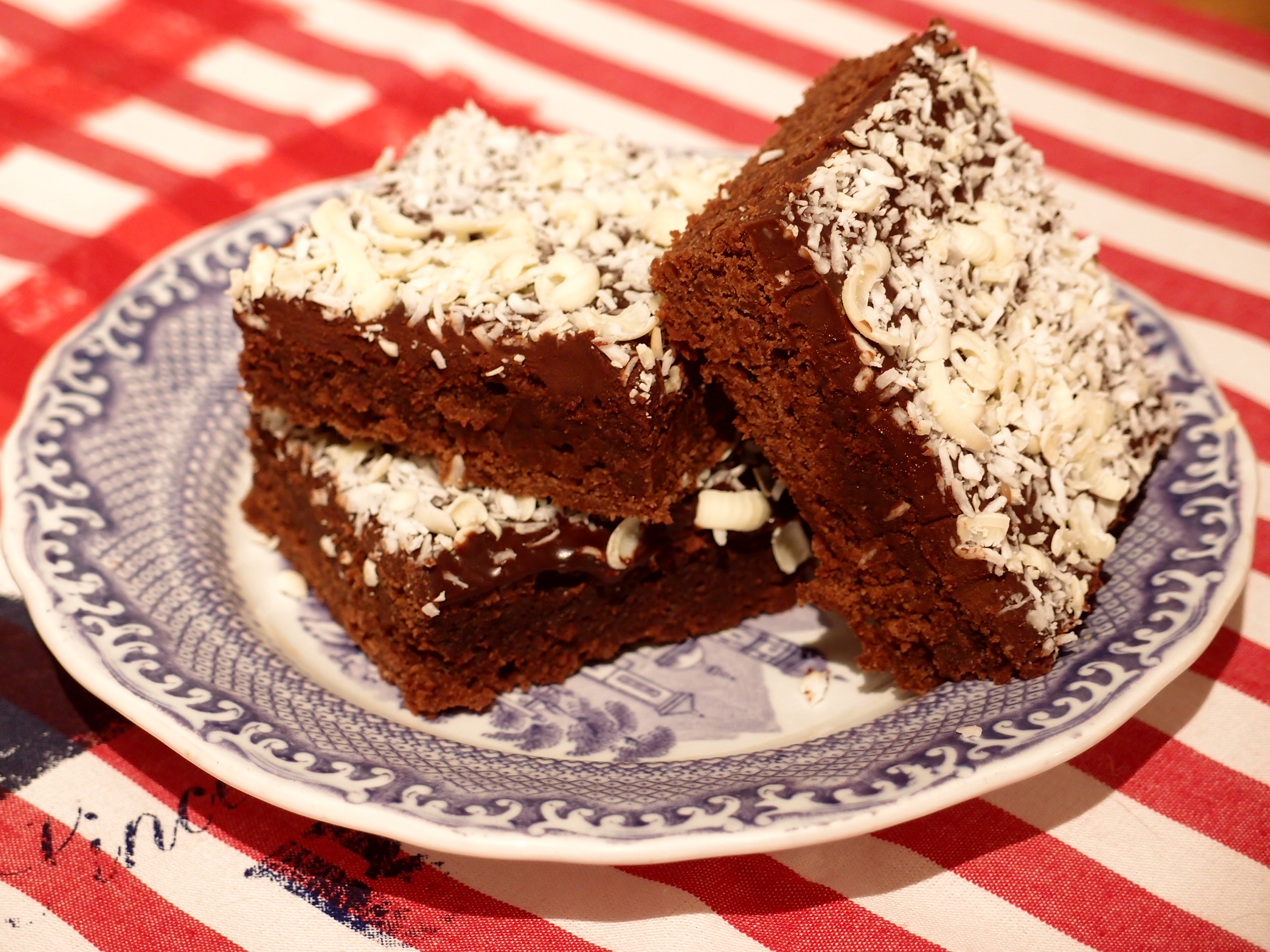 Florsockerglasyr: Smält smöret och blanda ner resten av ingredienserna till en trögflytande glasyr. Smaka av mängden kaffe. (Jag använder även espressopulver för att slippa blöta ner glasyren med flytande kaffe som i sin tur bara kräver mer florsocker vilket ger en sötare glasyr). Bred över kakan och toppa med kokos. Ställ kallt att stelna. Går bra att frysa in.