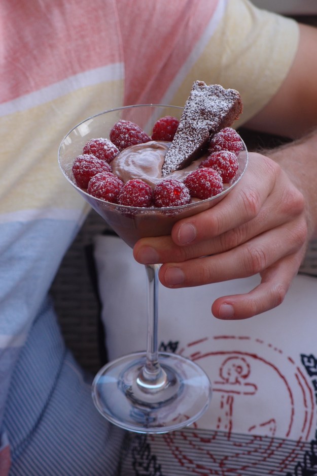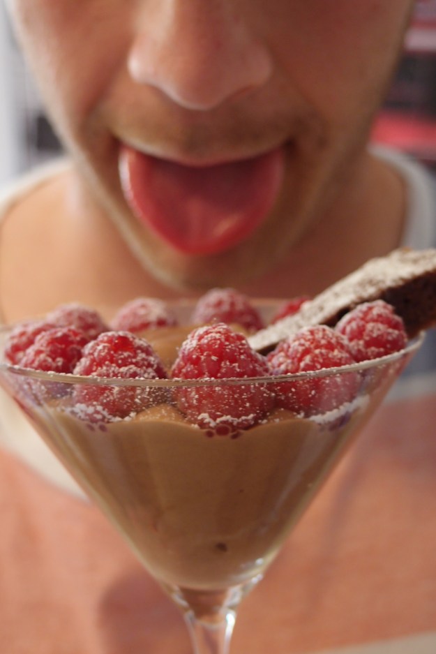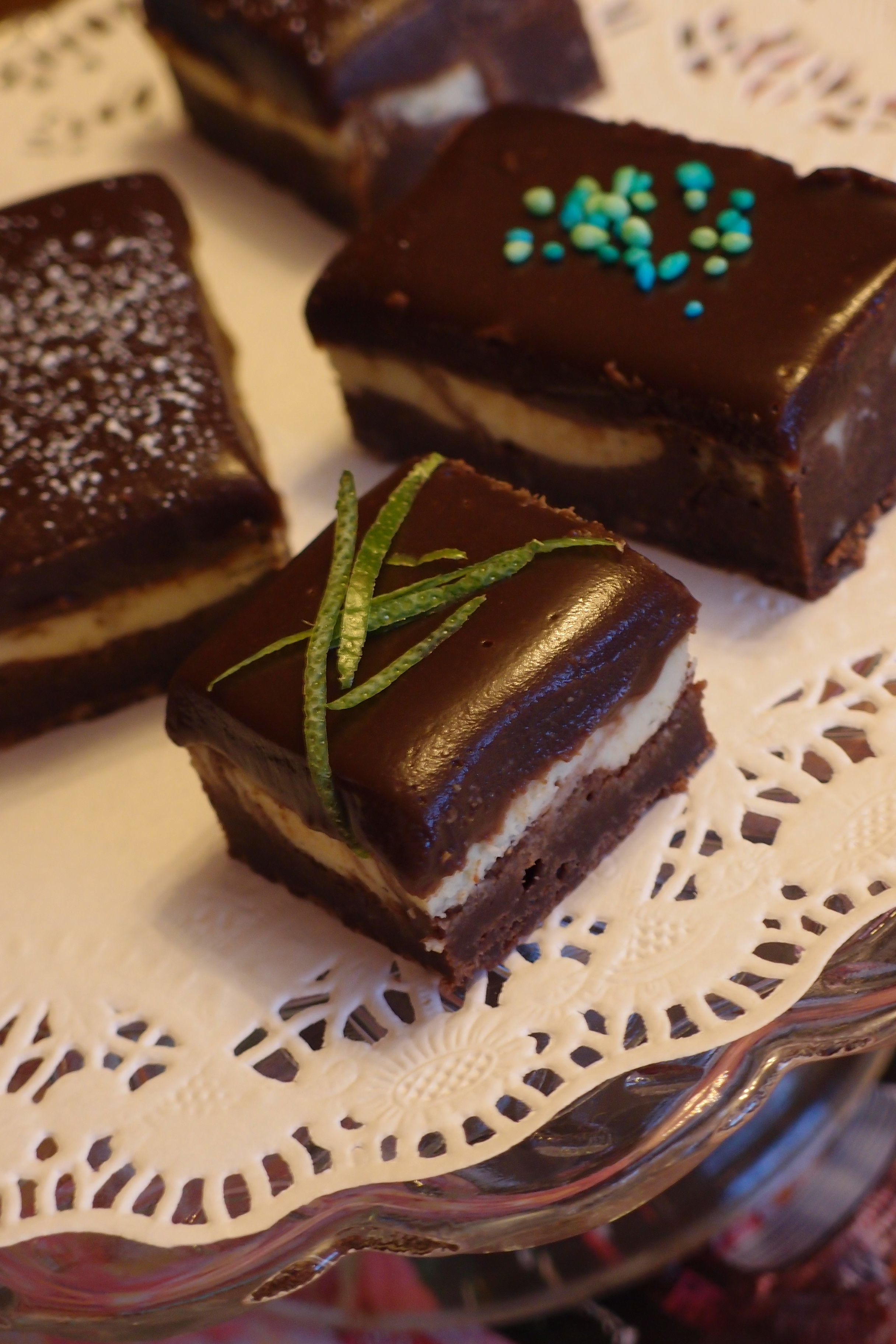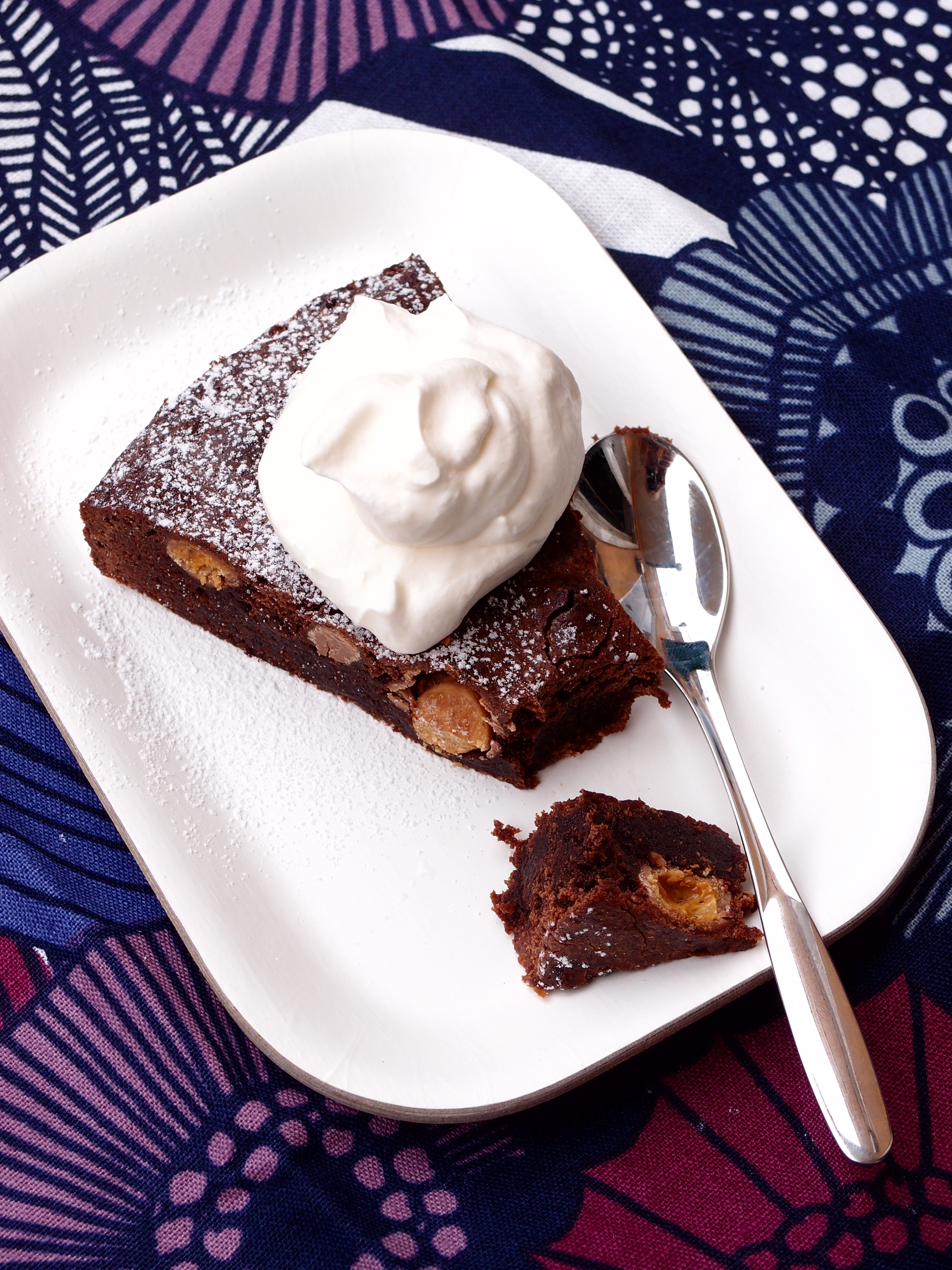 Jag var tvungen att provsmaka den här medan den fortfarande var ljummen och då var den riktigt kletig i konsistensen. På bilderna har den stått ute i kylan på balkongen ett dygn och fått den här magiskt sega, mjukkladdiga krämigheten. Älskar också chokladknapparna som ger lite bitighet till kakan. Aaaaaaah!
