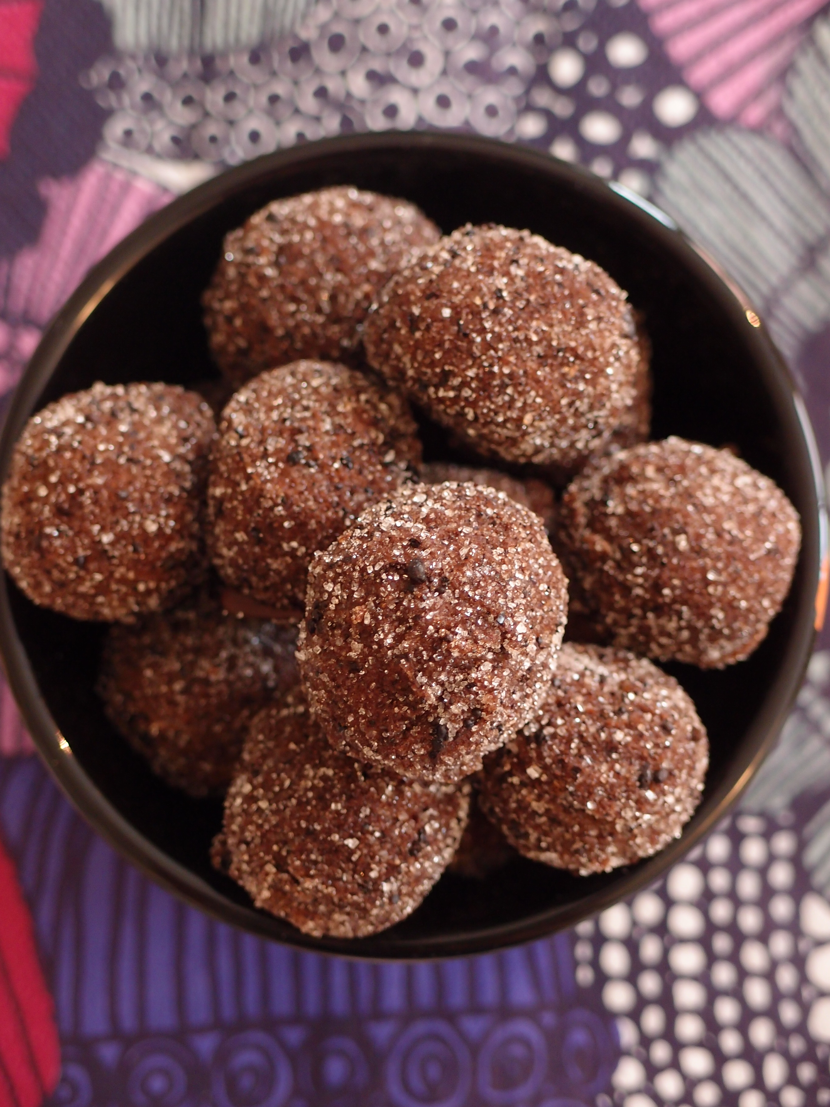 Jag skriver som jag brukar; använd tajta plasthandskar när du rullar tryfflar (finns bland städartiklar i matbutiken eller på Clas Ohlson) och stå inte i närheten av en varm ugn. Passa på att rulla när köket är svalt och dina händer är svala och inte kokheta. Det blir så lätt kletigt annars….