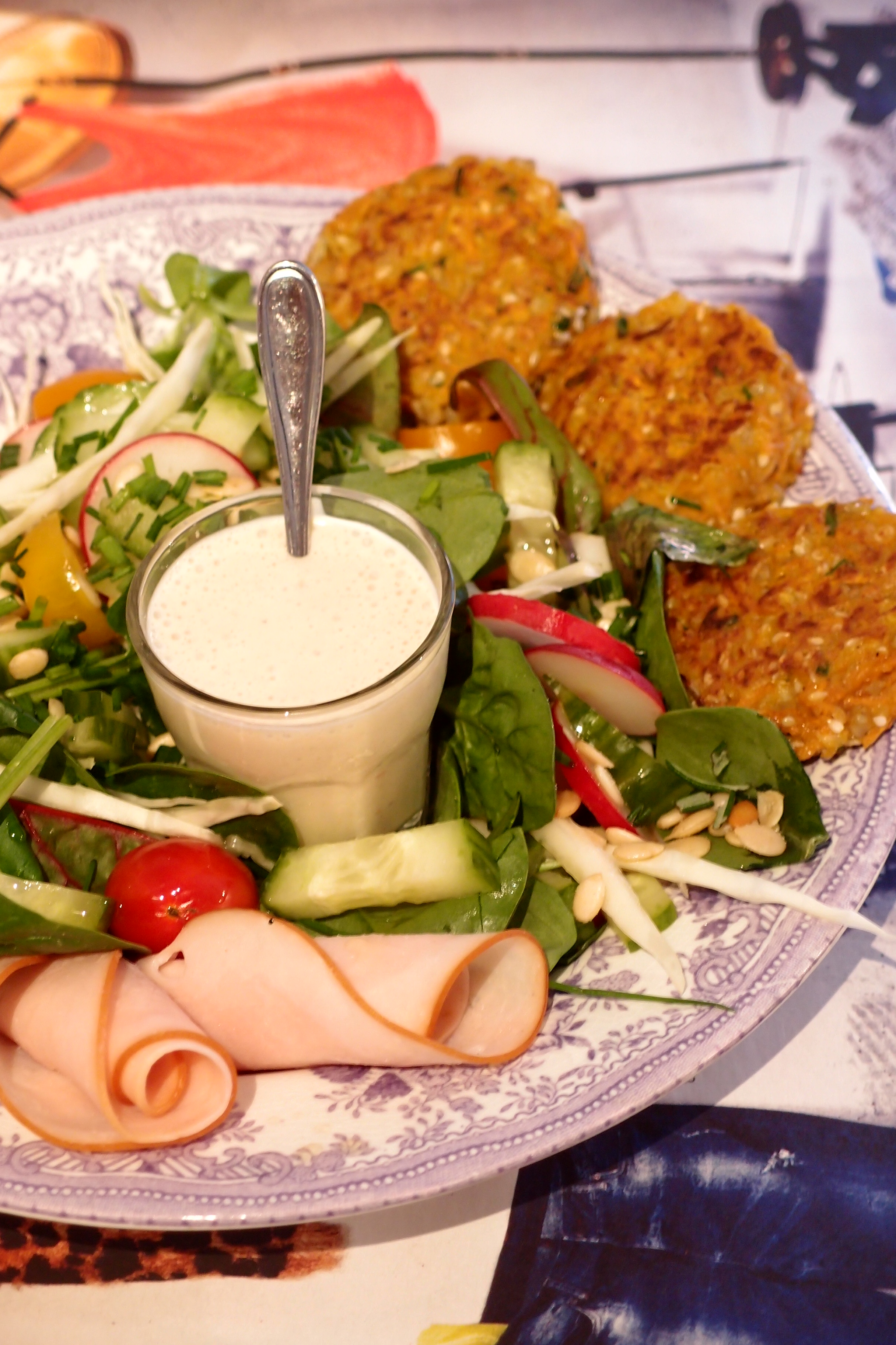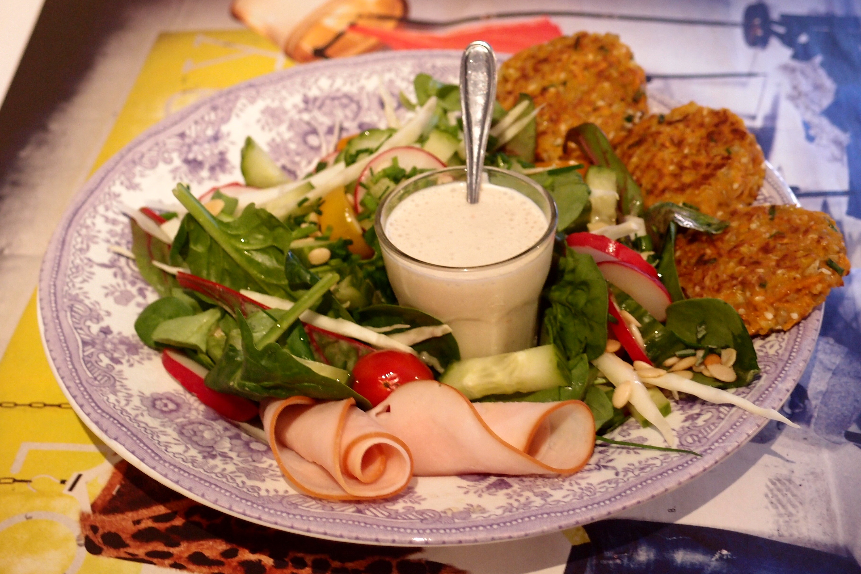 Idag bjuds det på sallad med blue cheesedressing, kalkon och kryddiga morotsbiffar. Yammey! 2 bra recept med andra ord och det finns inget som säger att man måste kombinera dessa två…. det var bara just så det blev på min tallrik.