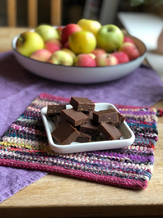 Smält jordnötssmör (1 dl) och kokosolja (0,5 dl – jag blandar med och utan smak) i en liten kastrull. Rör ner kakao (2 tsk) och lönnsirap (ca 1-2 msk). Häll upp i en liten klädd plastburk och låt stelna i kylen. Skär upp i bitar. Den här fudgen mjuknar snabbt, så ät direkt från kylen el låt den stå i frysen en stund.