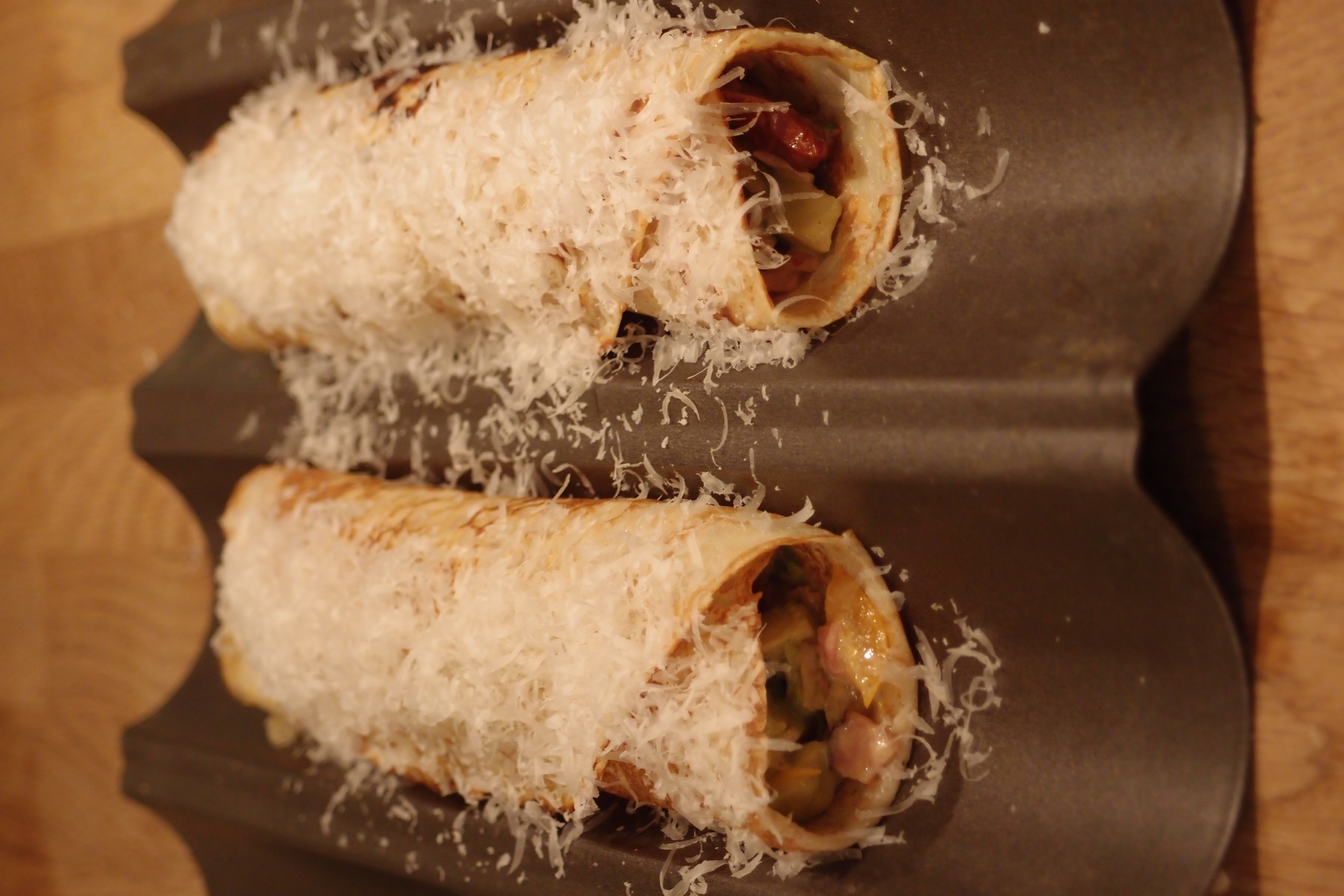 Vispa hälften av mjölken med ägg, salt, socker och vaniljsocker. Vispa ner vetemjölet och sedan resten av mjölken. Smält smöret och vispa ner hälften av det i smeten. Låt gärna smeten svälla i cirka 30 minuter.