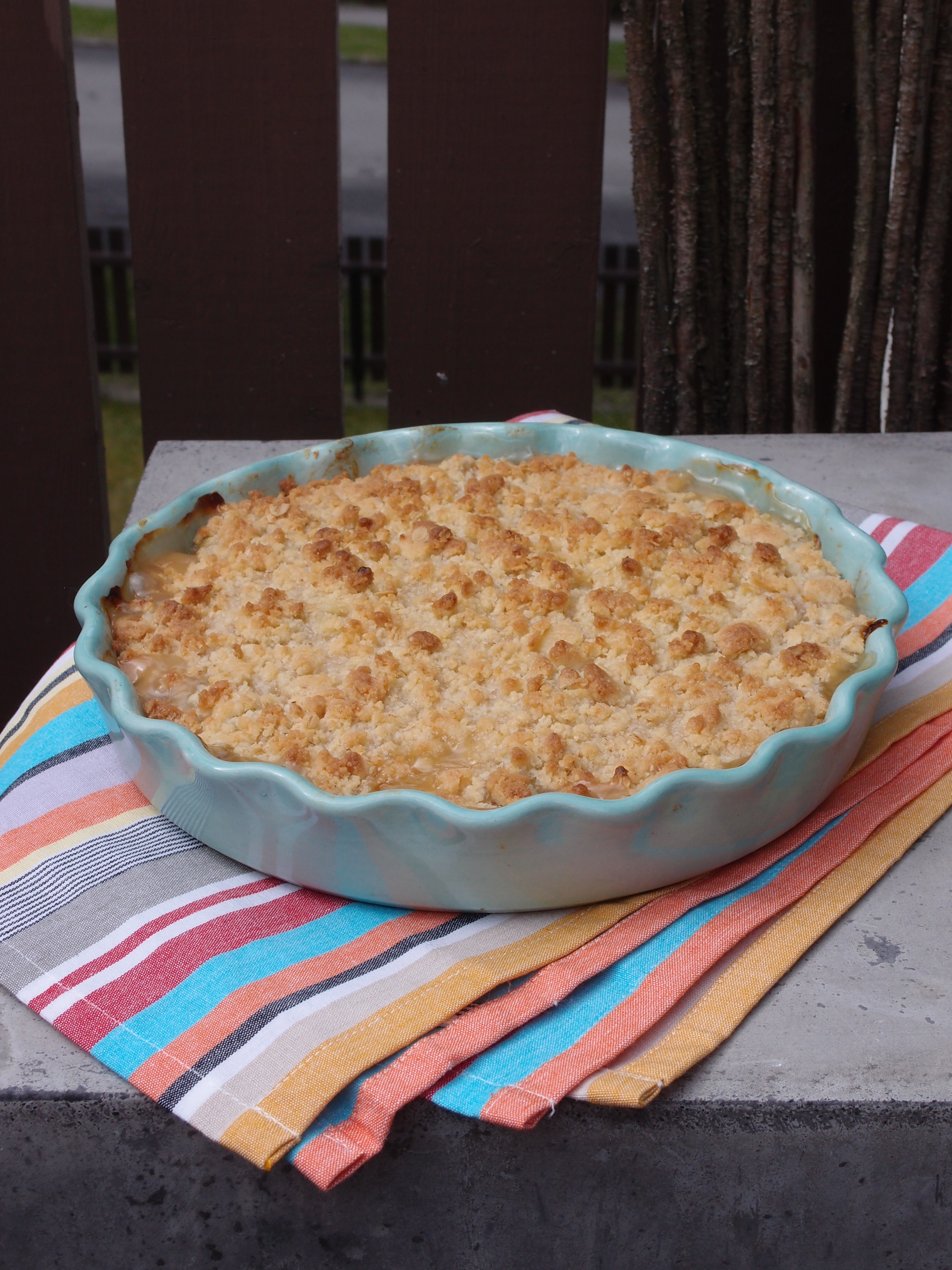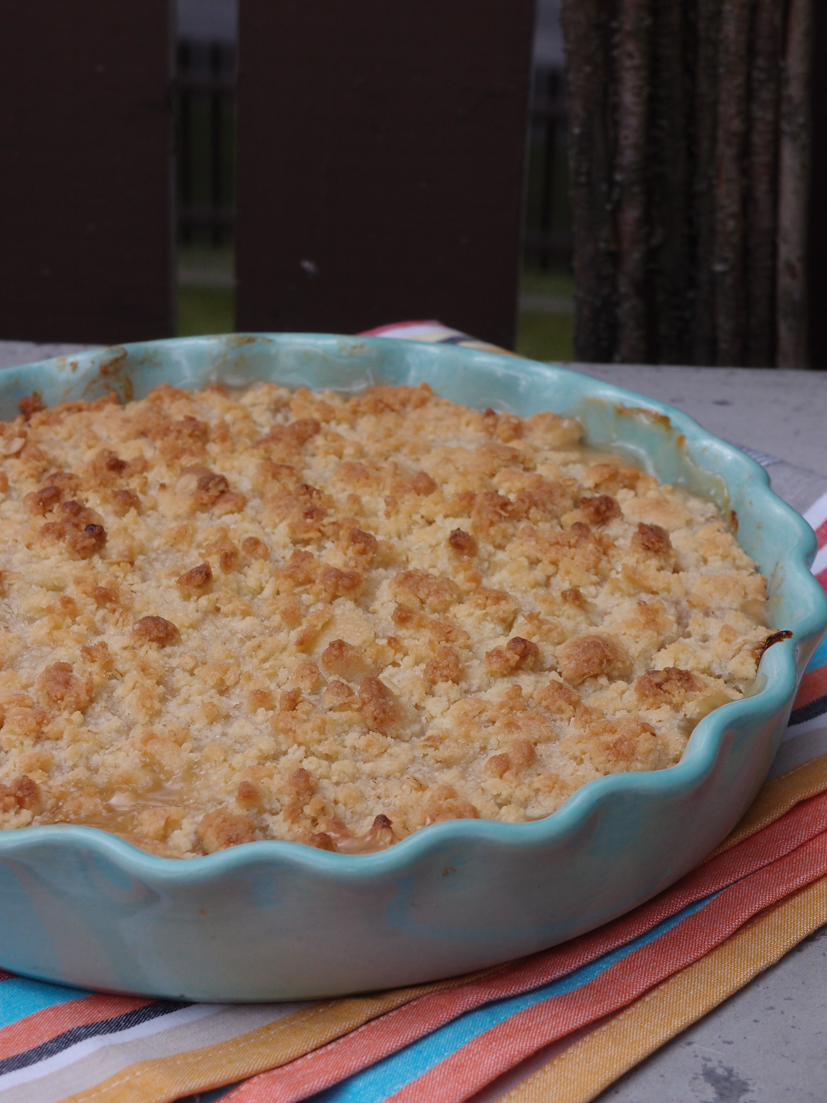 Grädda pajen i mitten av ugnen i ca 20-30 minuter eller tills smulorna får vacker färg. Servera gärna ljummen med vaniljsås, vaniljgrädde eller vaniljglass.