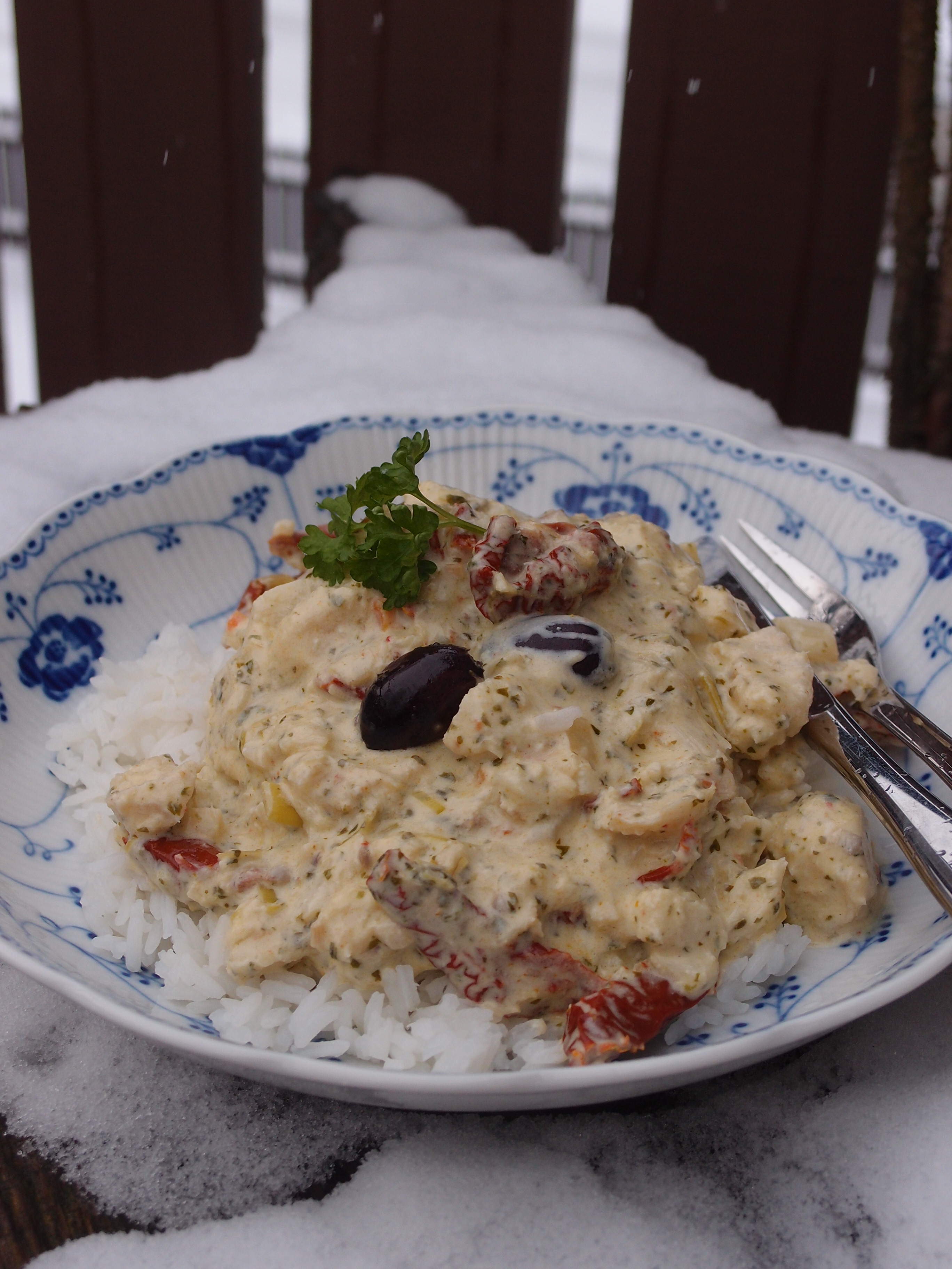 Gräddig sås full med smak av basilika, persilja och vitlök. Jag smaksatte desutom med soltorkad tomat och oliver. Smaskens!