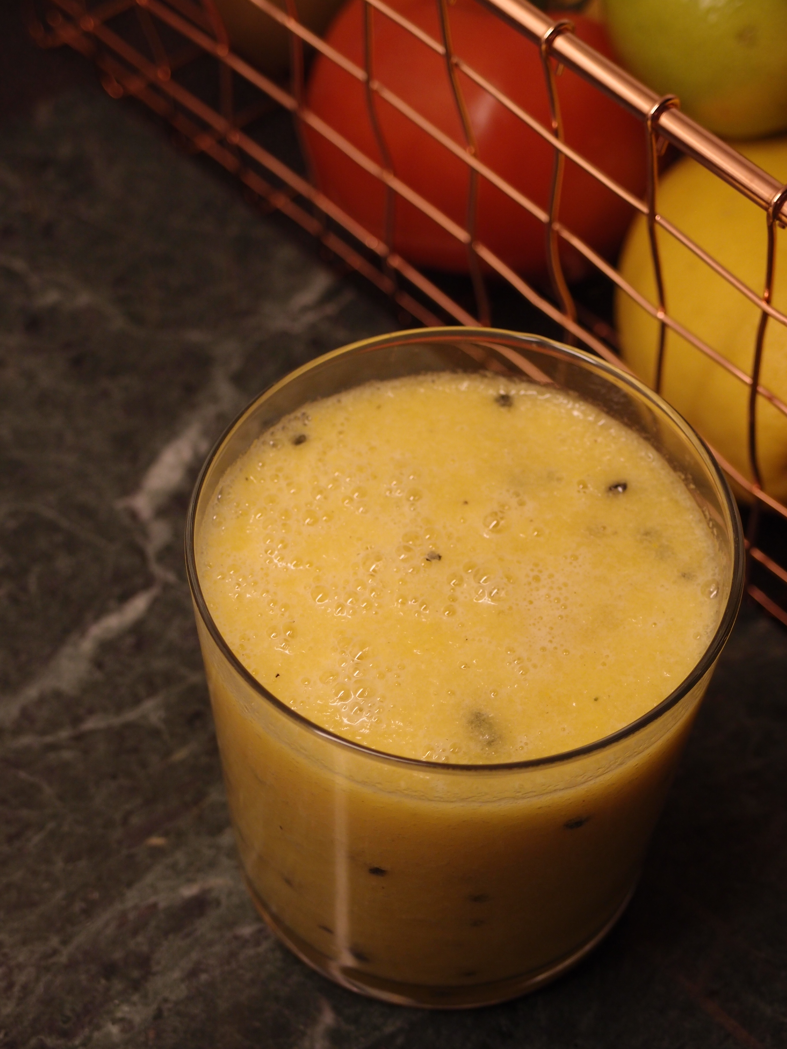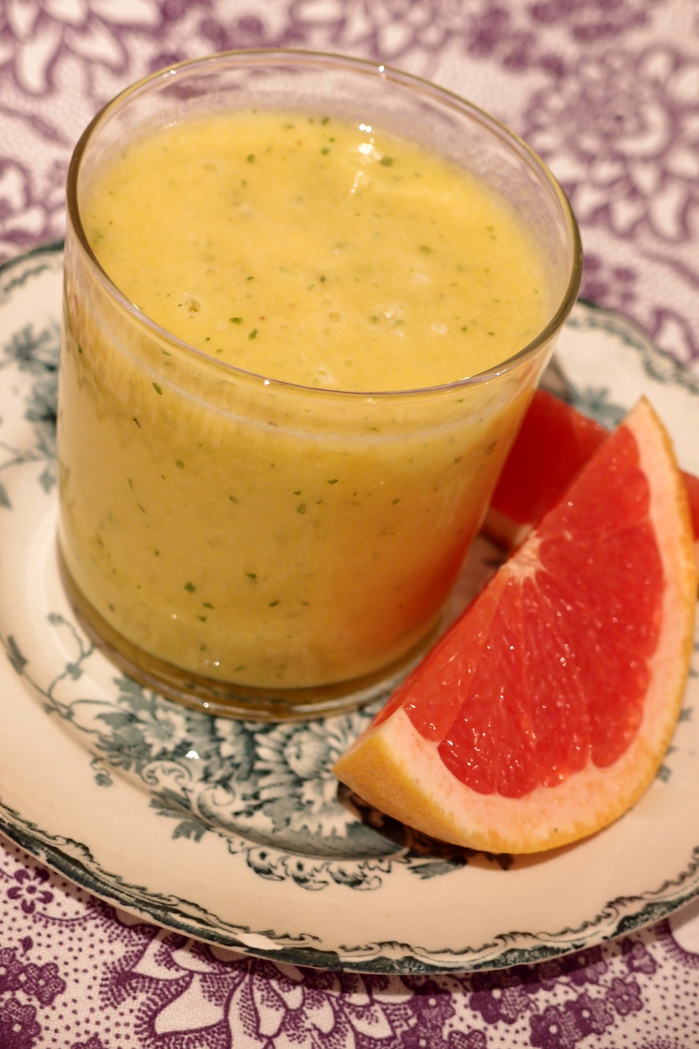 Mixa samtliga ingredienser till en slät smoothie och servera genast.