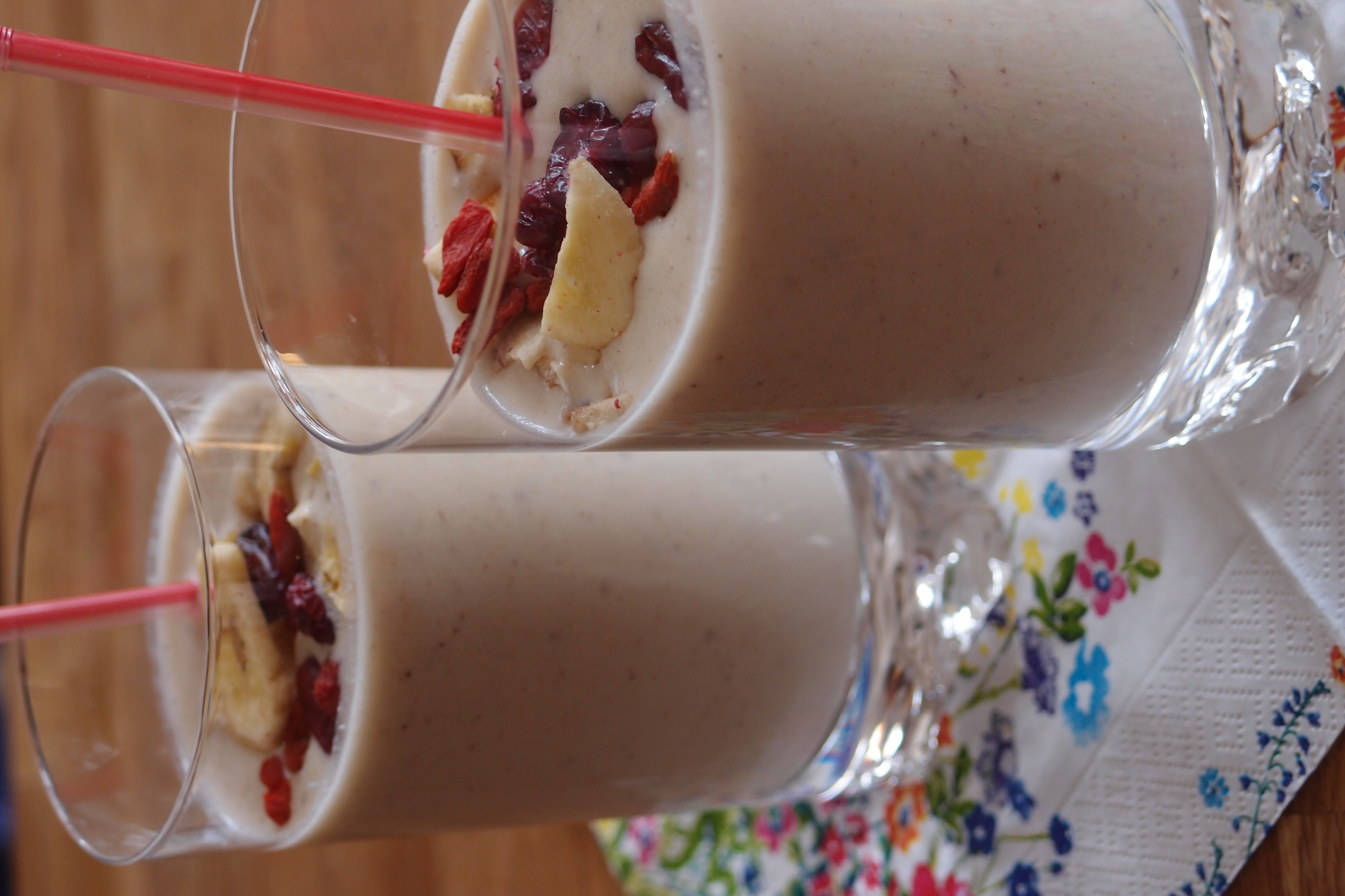 Den här godingen innehåller följande; banan, cashewnötter, dadlar, havrekli, vaniljyoghurt, havredryck och vanilj, kanel och pyttelite riven muskotnöt. Mixa länge så att nötterna blir riktigt finfördelade. Smaka av mellan varven så du får den konsistens och smak du vill åt. Toppa gärna med bananchips, gojibär och tranbär.