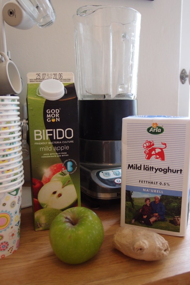 Mer än så här behövs inte för att mixa ihop en grym äppelsmoothie. Lite yoghurt, syrligt äpple, godaste äppeljuicen och en bit färsk ingefära. (Konsistensen blir inte helt slät när man mixar äpple).