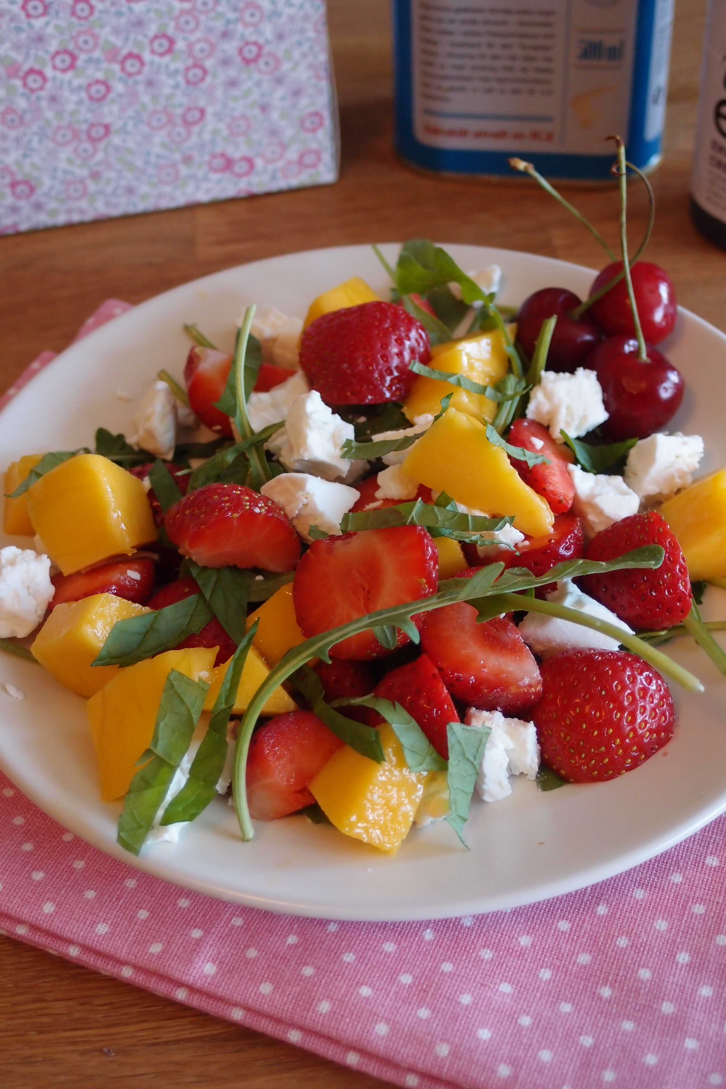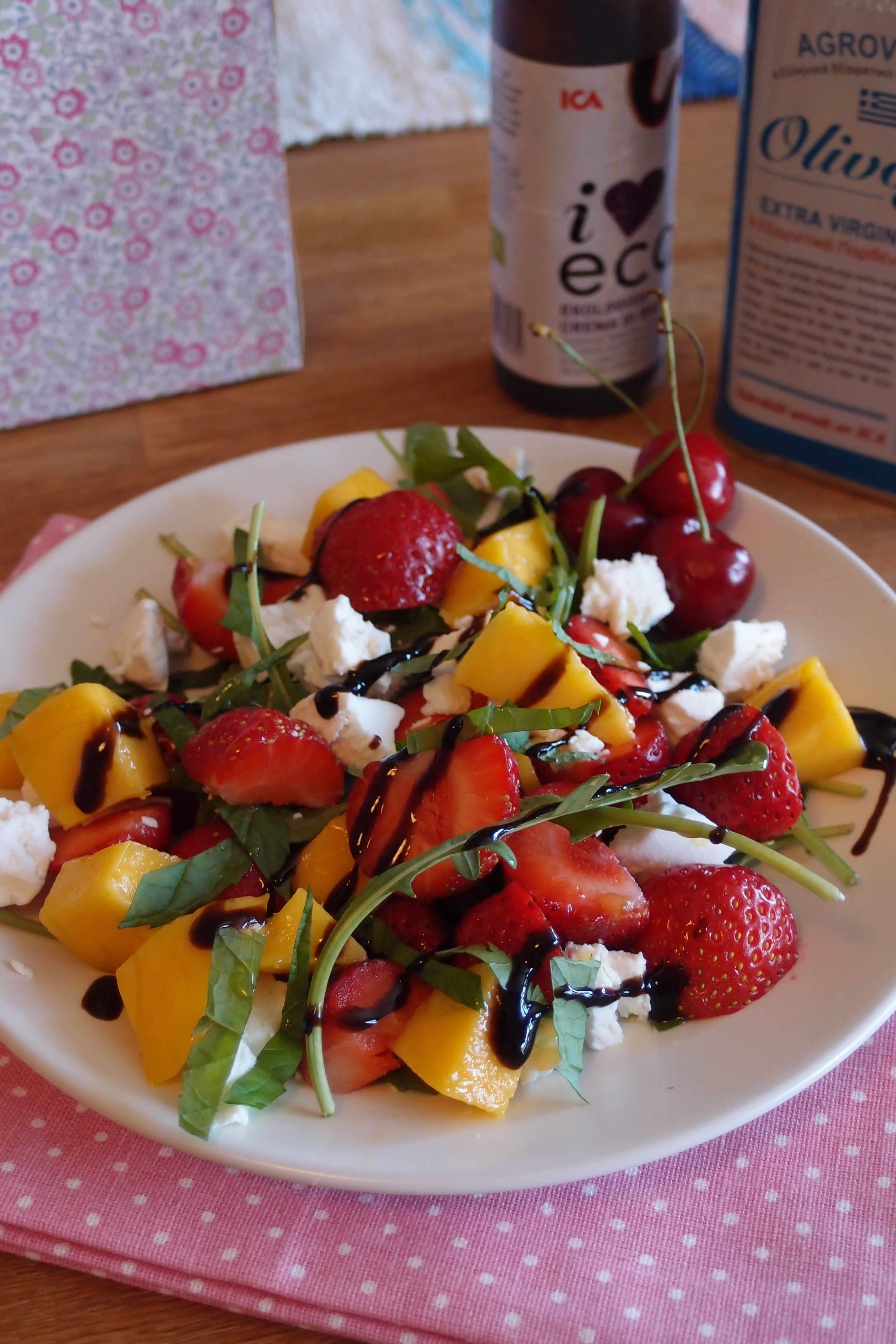 Vattenmelon, nektarin, jordgubbar, fetaost, saltrostade mandlar, citronmeliss och min nya sommarfavorit; balsamico hallon (finns bland balsamvinäger och oljor i mataffären).