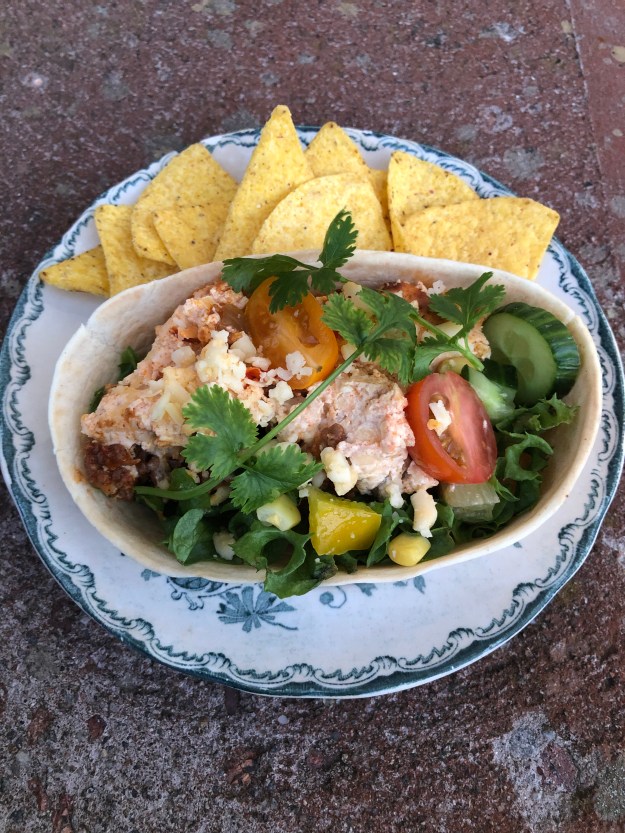 Kryddig och krämigt ostig, ja väldigt god! Skönt att lassa ner denna gratäng i en mjuk stand ‘n stuff (”mjuk tortillaskål”), toppa med lite grönsaker, guacamole och generöst med koriander. Muuums!