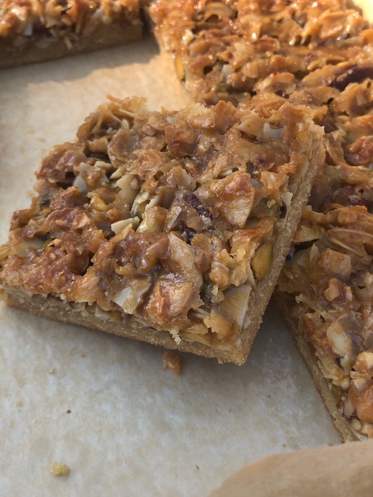 Galet goda och lyxiga toscarutor. Mördegsbotten toppad med ett frasigt täcke av blandade nötter. Enkla att skära upp i såväl små kuber som generösare rutor. Självklart har jag varken snålat på vanilj el salt – två smaker som gifter sig bra med tosca.