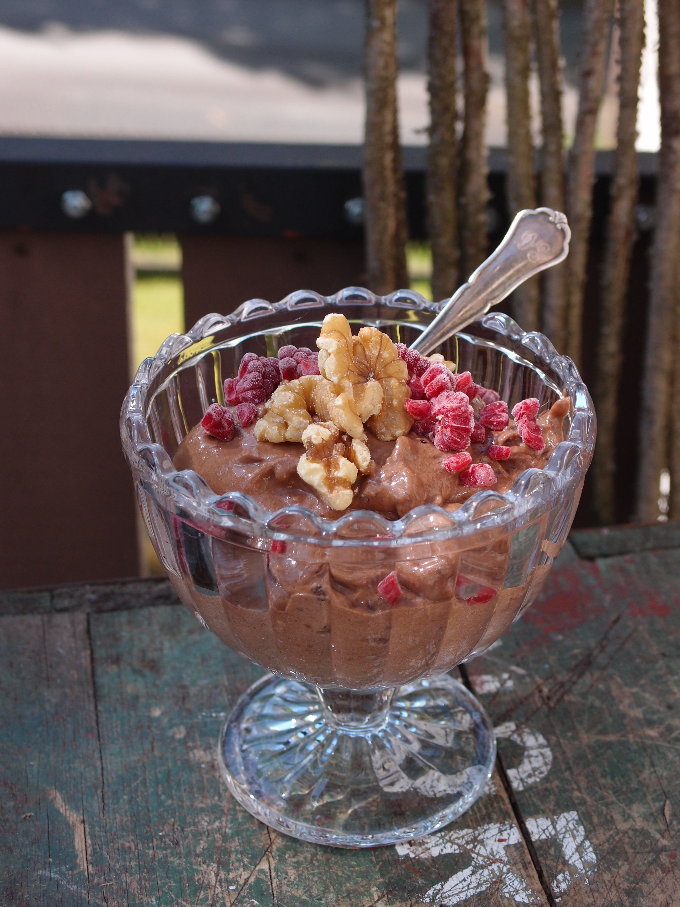 Toppa med valnötter och krossade frysta hallon och servera omgående. Räcker till en portion.