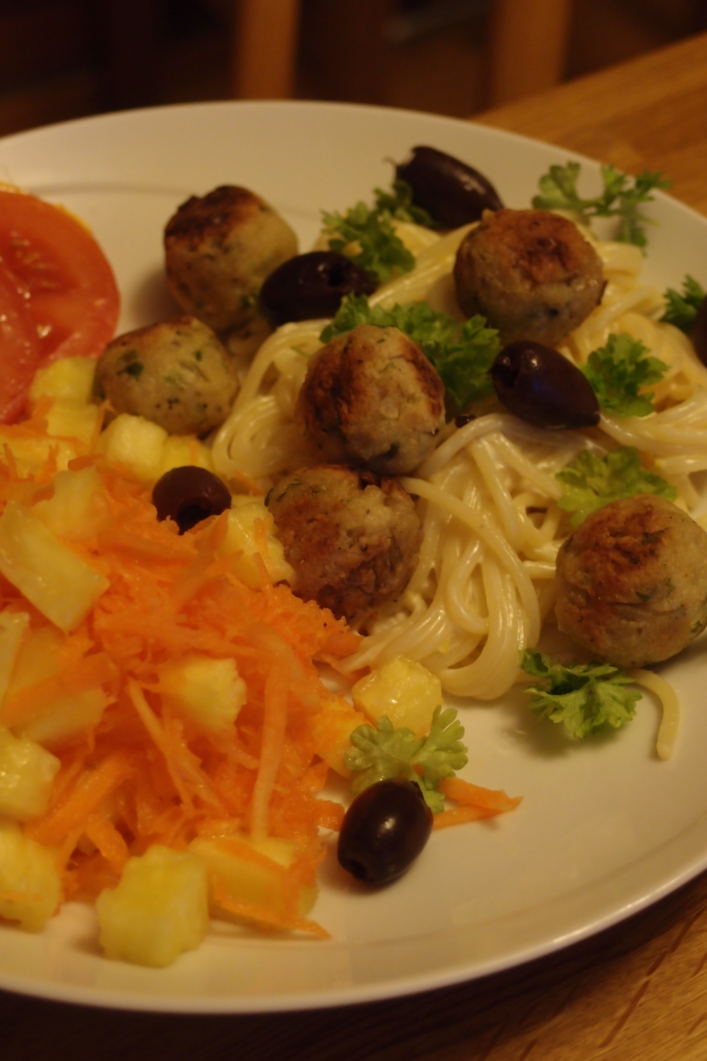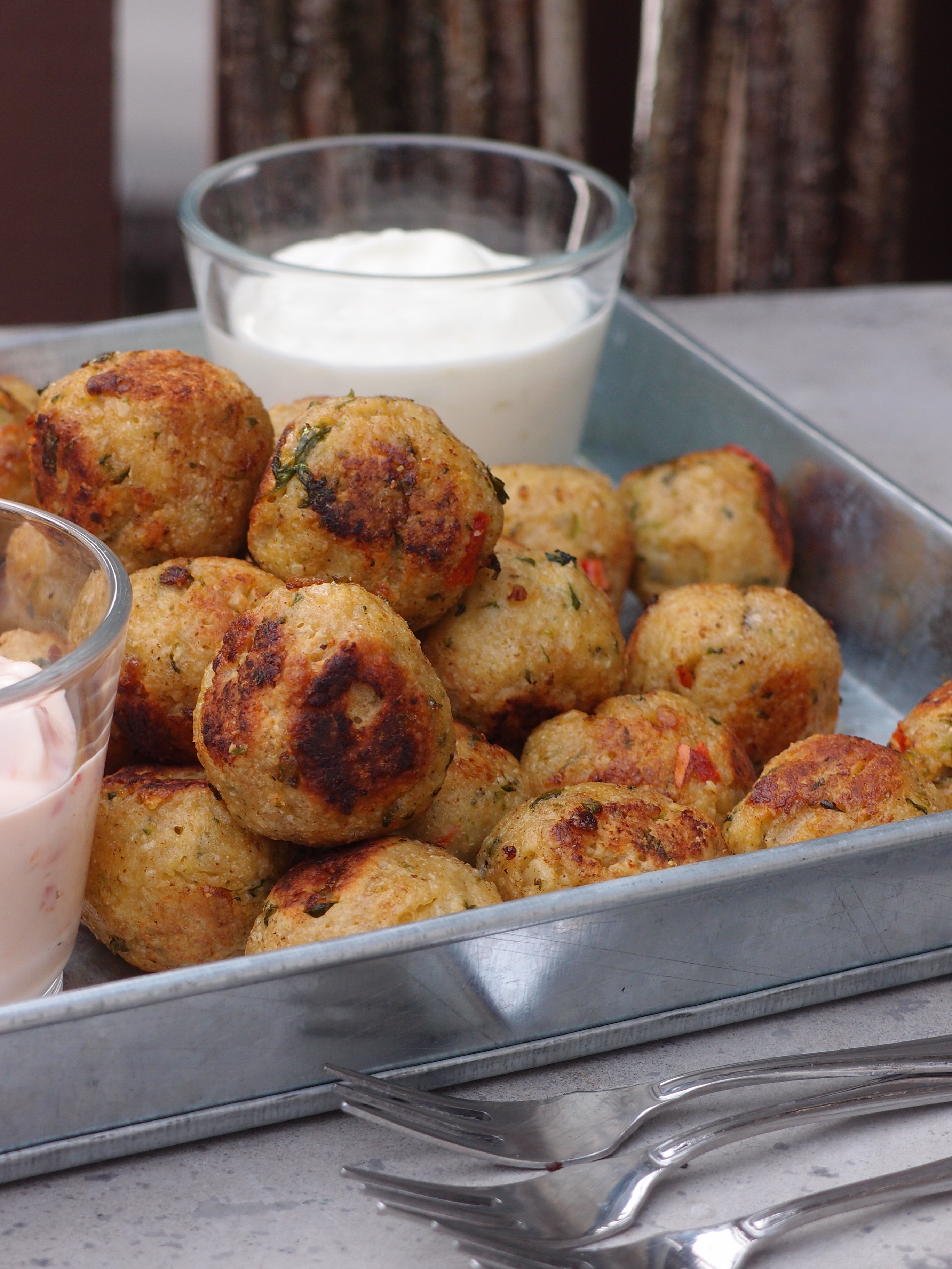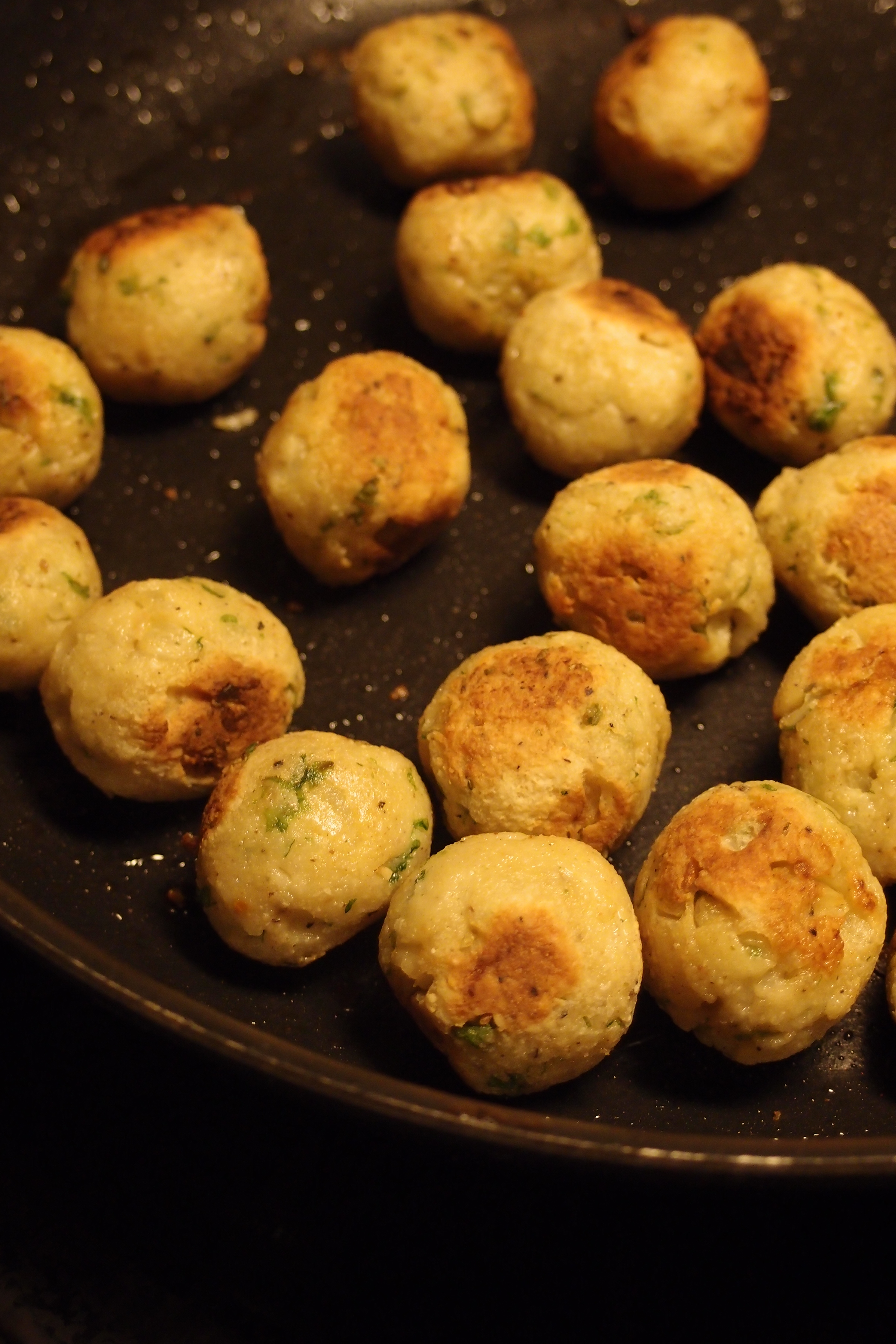 Blanda ingredienserna och forma små bollar. Stek i smör/olja i stekpannan tills de är genomstekta (10-15 minuter) och fått gyllene färg.